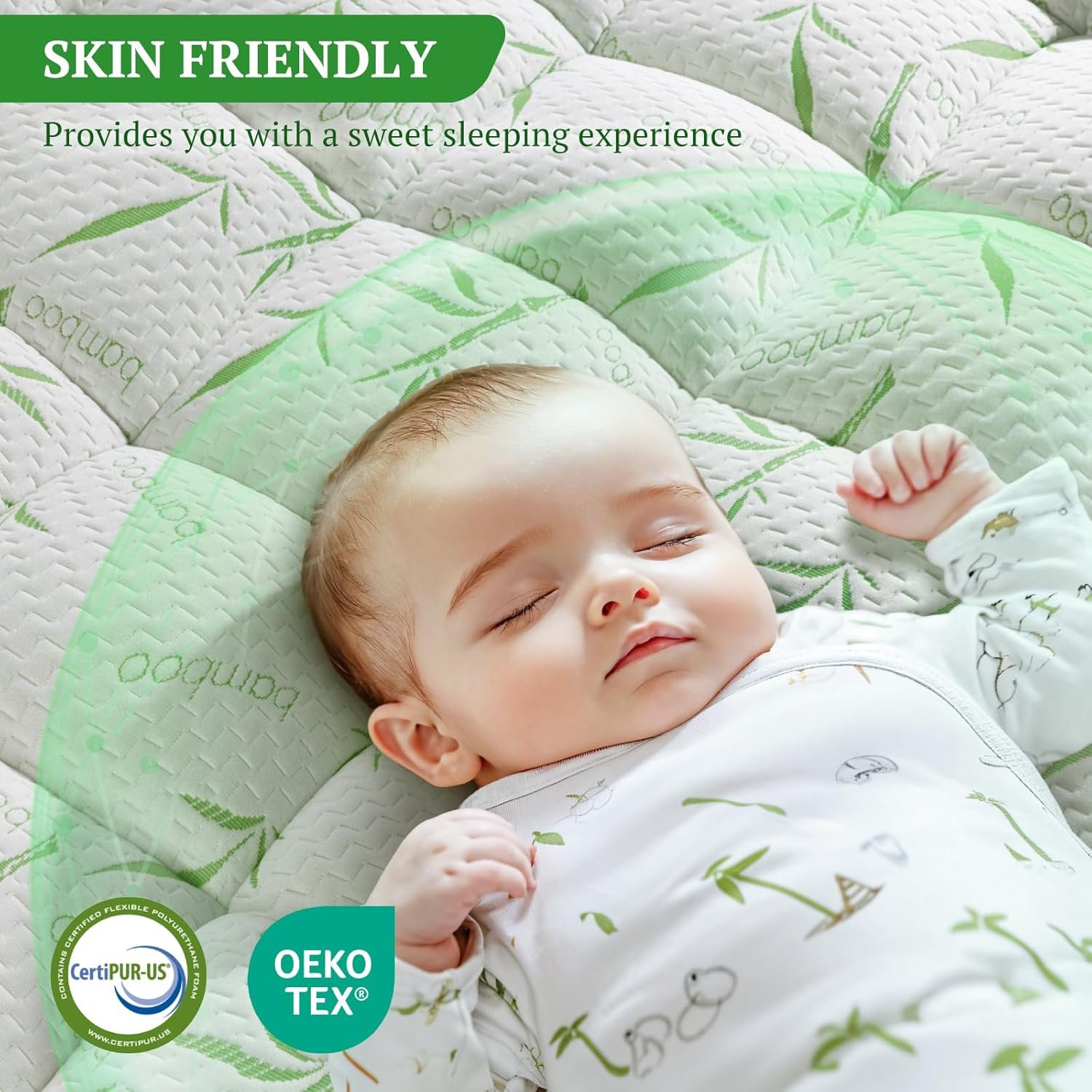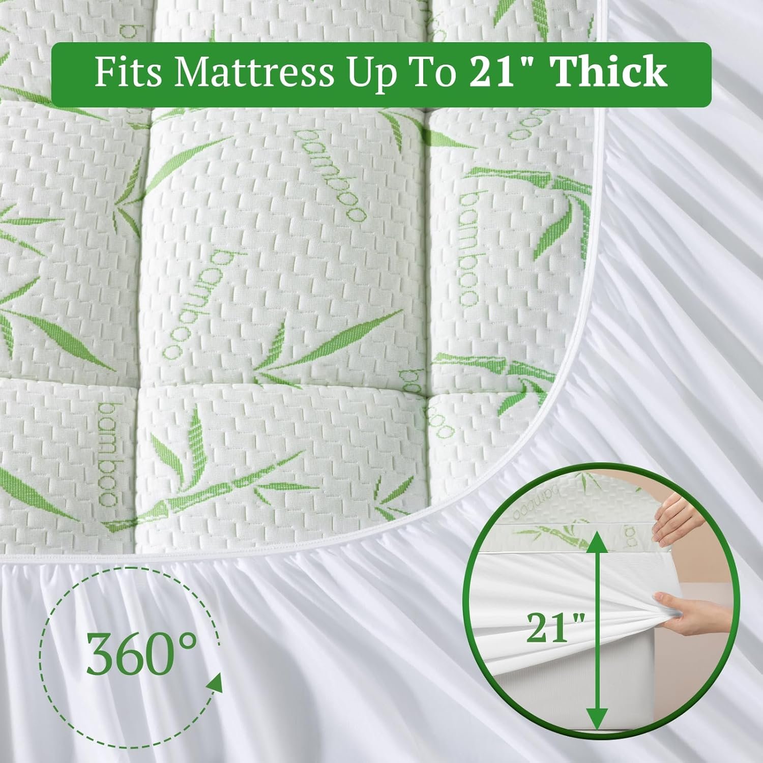 【 DEEP POCKET DESIGN,SAY GOODBYE TO CLUTTER 】Non-slip deep pockets in mattress pads queen size -stretchy knit skirt is designed to be deep enough to fit securely on cooling mattress pad with a depth of” 8 -18″.No matter how much you toss and turn with your child while sleeping, every corner will stay in place,ensuring quality sleep while saying goodbye to clutter.