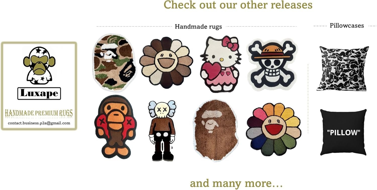 Introducing our handmade BAPE rug with baby milo design, a truly unique and one-of-a-kind piece for any fan of the iconic streetwear brand. Our rug is carefully crafted by skilled artisans, resulting in a high-quality product that stands out from mass-produced options. Using traditional techniques, our rug is made from soft, yet durable materials that are designed to withstand regular foot traffic and wear and tear. The stitching is also done by hand, ensuring a level of detail and precision that is unmatched by machine-made options. At 27 inches by 20 inches, the rug is compact enough to fit in smaller spaces, but also large enough to make a statement in a larger room or area. Our handmade BAPE rug is a versatile addition to any home. It can be used in a variety of ways, such as a decorative accent in a bedroom, a statement piece in a living room, or a functional addition to a game roog or workspace. Plus, knowing that your rug was crafted with care by skilled artisans adds an extra layer of appreciation and value to this unique piece.