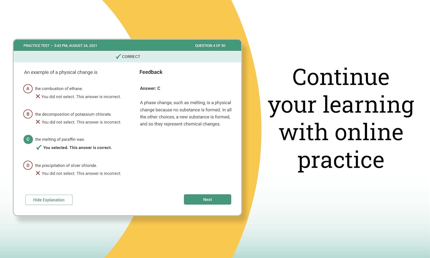 Inside you’ll find:Comprehensive Content Review: Begin your study with the basic building block of chemistry and build as you go. Topics include, atomic structure, chemical formulas, electrochemistry, the basics of organic chemistry, and much more.Effective Organization: Topic organization and simple lesson formats break down the subject matter into manageable learning modules that help guide a successful study plan customized to your needs.Clear Examples and Illustrations: Easy-to-follow explanations, hundreds of helpful illustrations, and numerous step-by-step examples make this book ideal for self-study and rapid learning.Practice Exercises: Each chapter ends with practice exercises designed to reinforce and extend key skills and concepts. These checkup exercises, along  with the answers and solutions, will help you assess your understanding and monitor your progress.Access to Online Practice: Take your learning online for 50 practice questions designed to test your knowledge with automated scoring to show you how far you have come.
