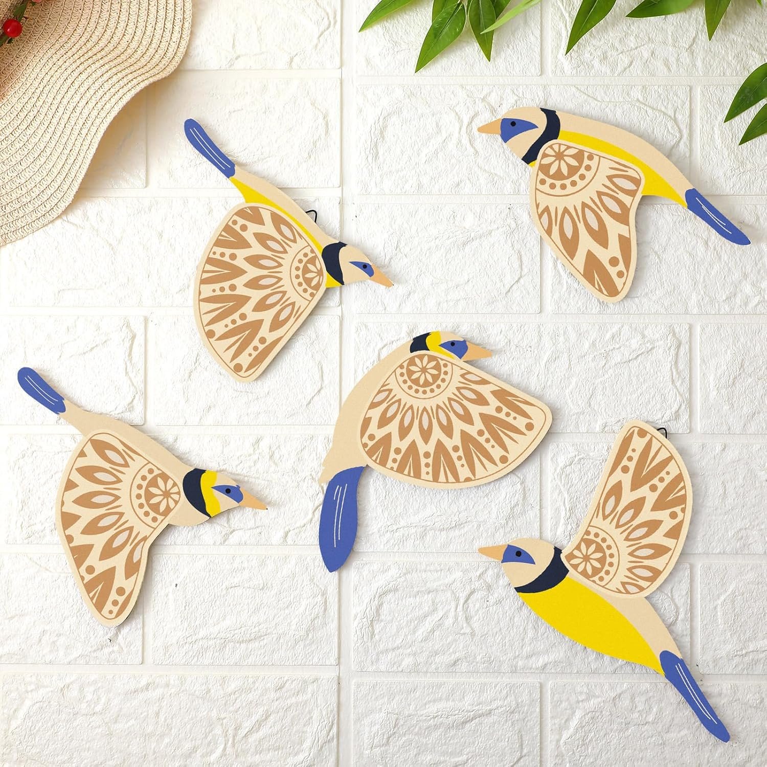 Barydat 5 Pcs Wooden Bird Wall Art Wood Flying Birds Wall Decor Rustic Folk Art Scandinavian Home Decor for Gift Living Room Bedroom Kitchen Office(Blue)