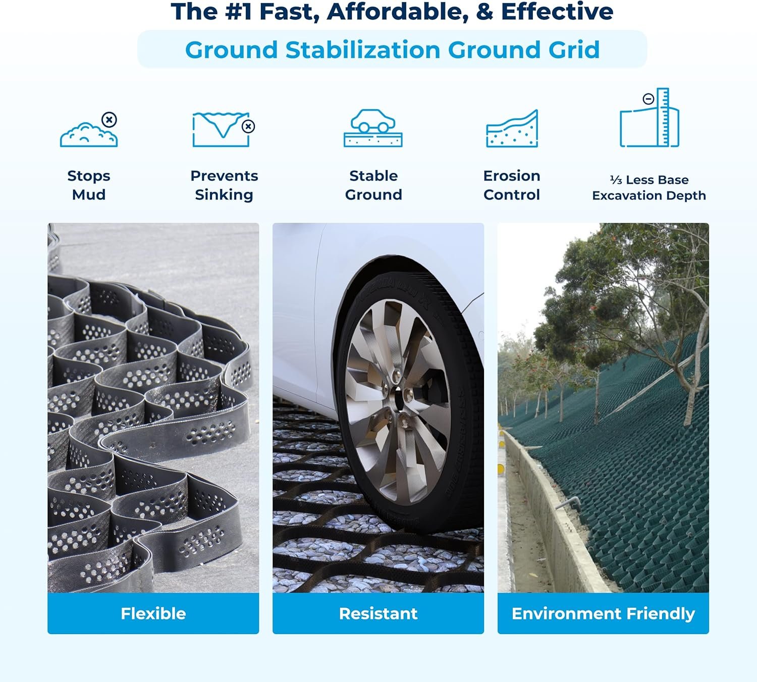 SAVES MONEY & TIME: This geogrid for retaining walls reduces fill needed for a strong base, cutting manpower costs. Geocells require only ⅓ the excavation depth compared to other materials like gravel, saving both time and money on your project.