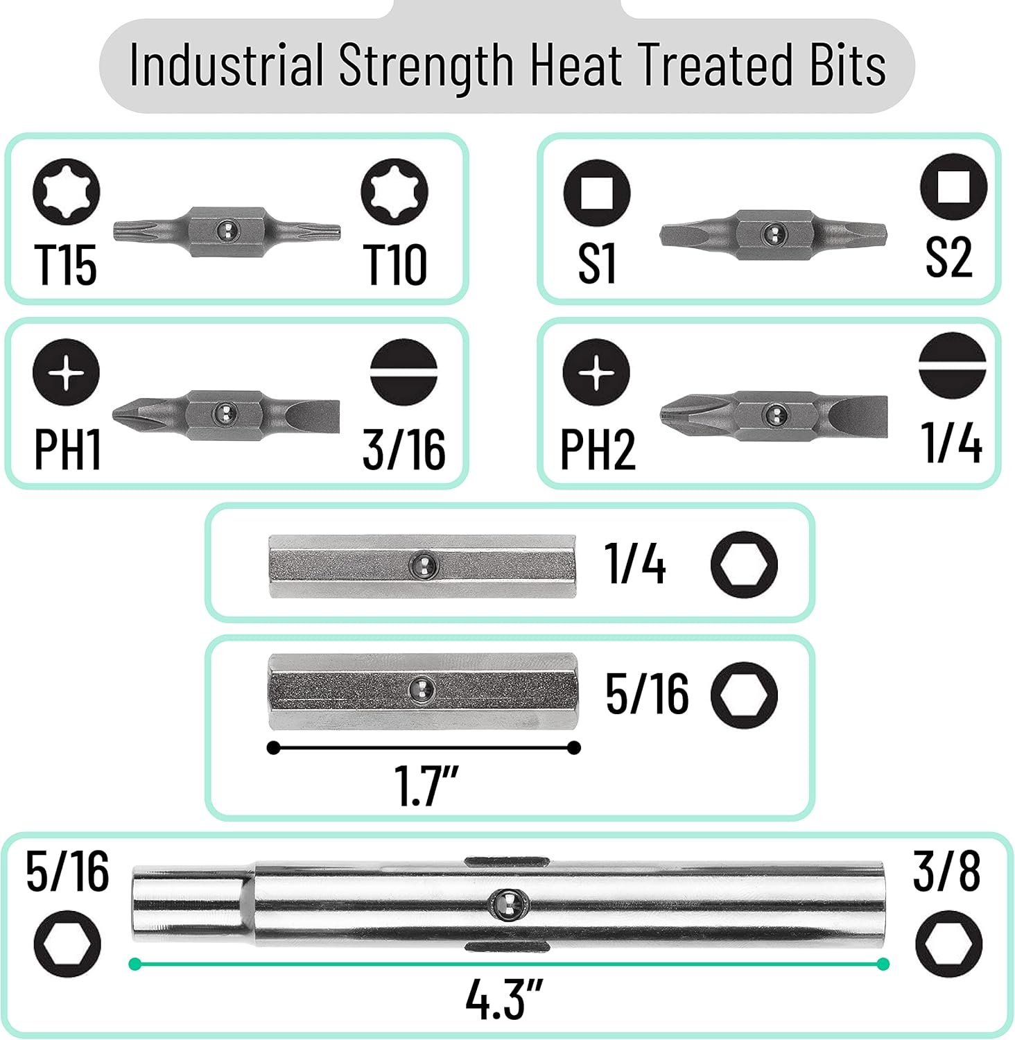 All in one screwdriver features interchangeable shafts for quick bit storage, and the multi screwdriver’s shafts become three standard nut driver sizes; Superior socket design for secure bit fit.