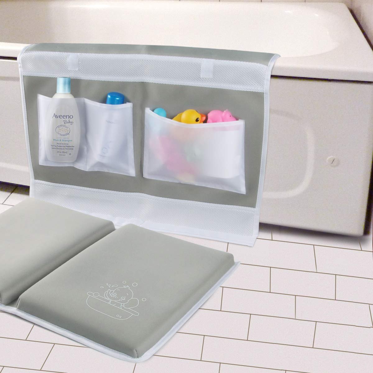 Bath Kneeler and Elbow Rest Pad Set – 1.5″ Thick Bath Kneeling Pad with Toy Organizer – Large Safty Kneeler Mat for Tub Bathing and Bathroom Time – Detachable and Foldable Child Bath Tub Mat – Gray