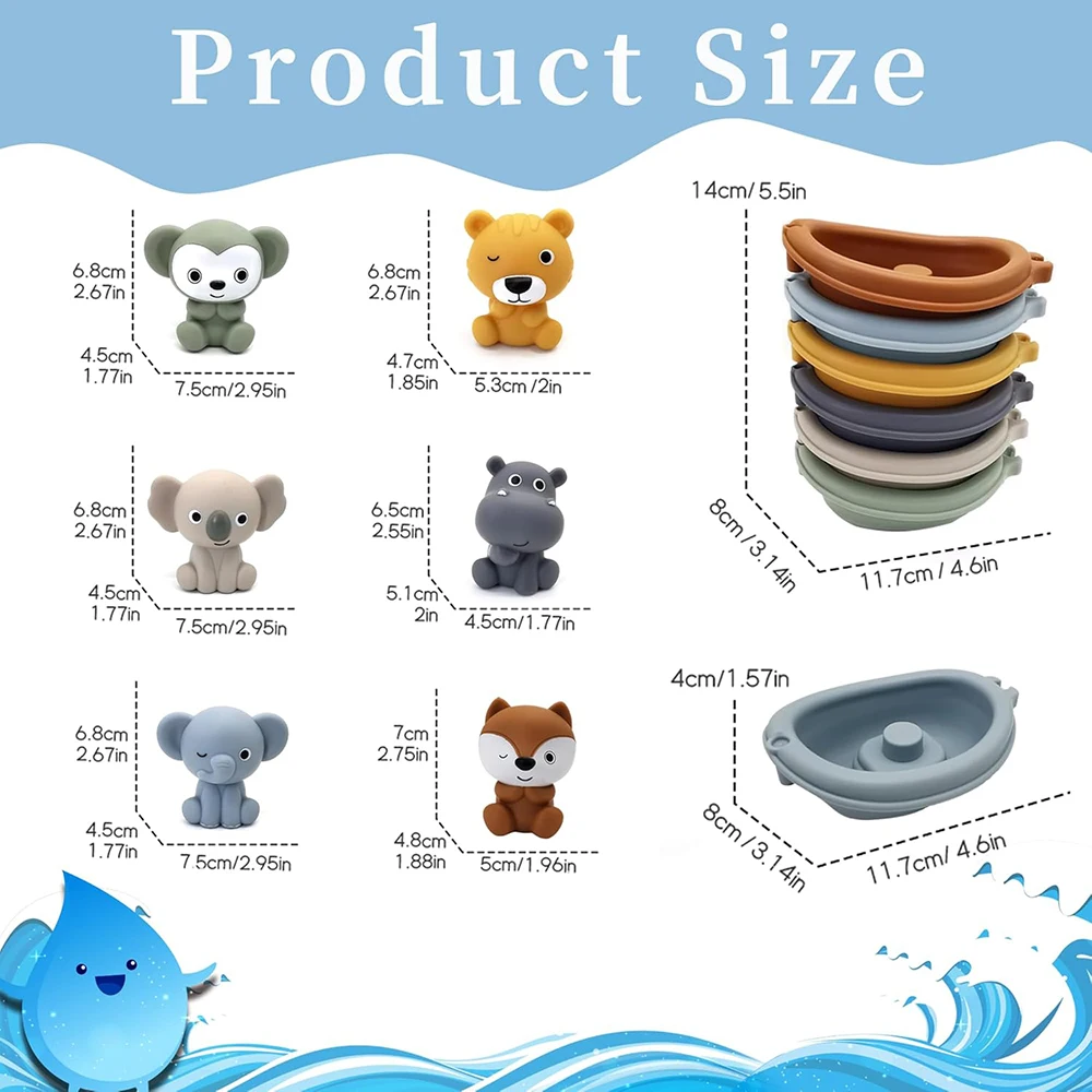 1.SAFETY DESIGN: These animal bath toys set are made of silicone, nontoxic, soft and no burrs, safe for children to use. Including 6 different animal finger puppets and 6 vibrant color floating boats.