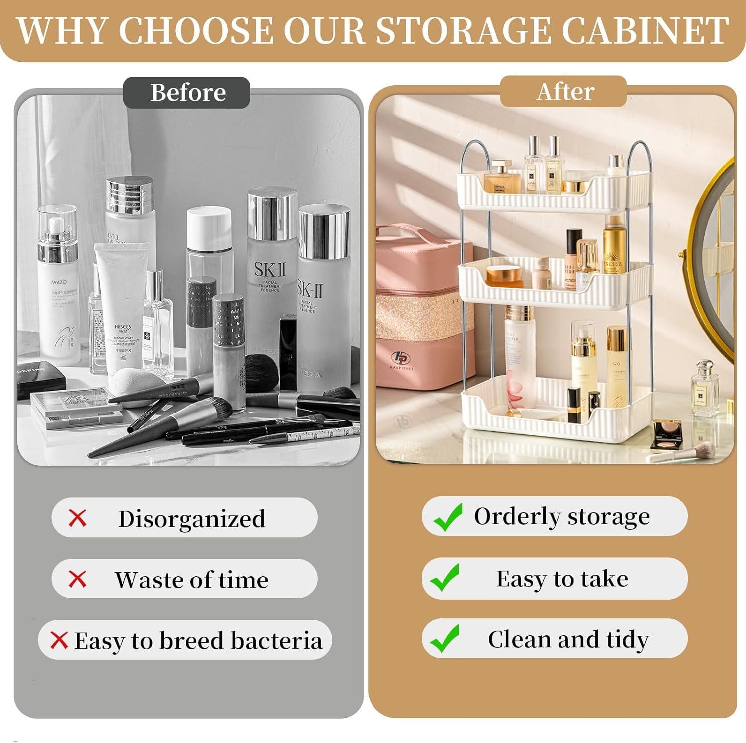 Vertical Height: 8.46” H between 2tier for cosmetic organizer, 8.46‘’H for 3tier and 6.3‘’ H to improve layering organization for products of different heights. Convenient access, the edge height of 2.36” also prevents items from falling due to collision during access