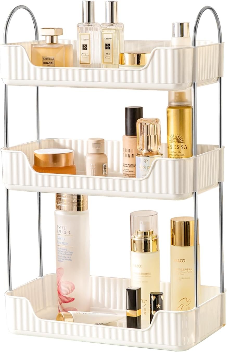 Bathroom Counter Cosmetic Organizer, 3 Tier-Cream White, Alloy Steel & PET Plastic, Rectangular, Tiered, Perfect for Toiletries & Cosmetics