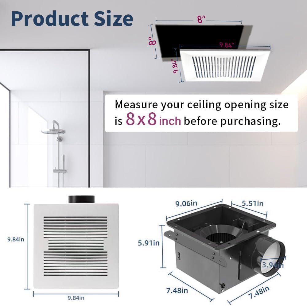 Easy to Install – Package include mounting fitting with no-cut design and ceiling mount ventilation, with Housing Size: 9.84in x 9.84in with 4in duct. Ceiling Mounting Opening: 8in x 8in. You can install it easily by yourself without a professor help, saves you the labour cost