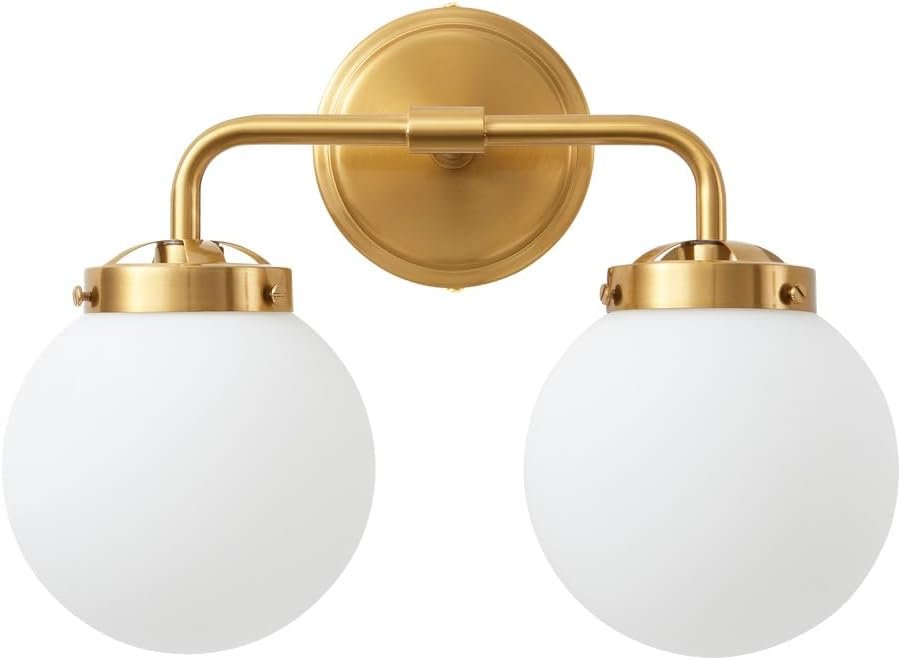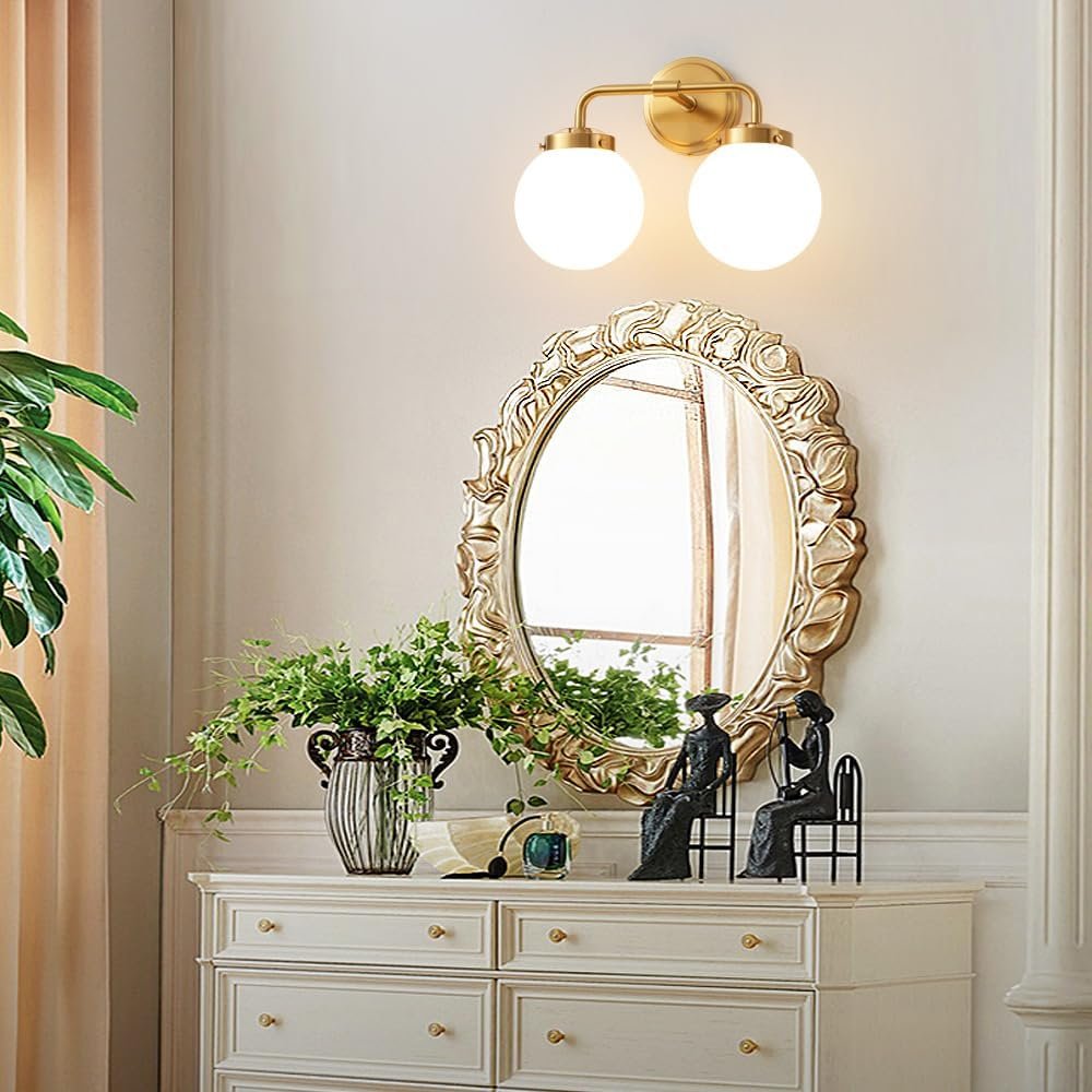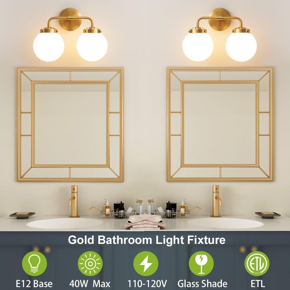 Bathroom Vanity Light Fixtures Over Mirror, Modern Brass Gold 2 Lights Wall Sconce Lighting with Milky Glass Ball Shades, Mid Century Farmhouse Bathroom Lighting