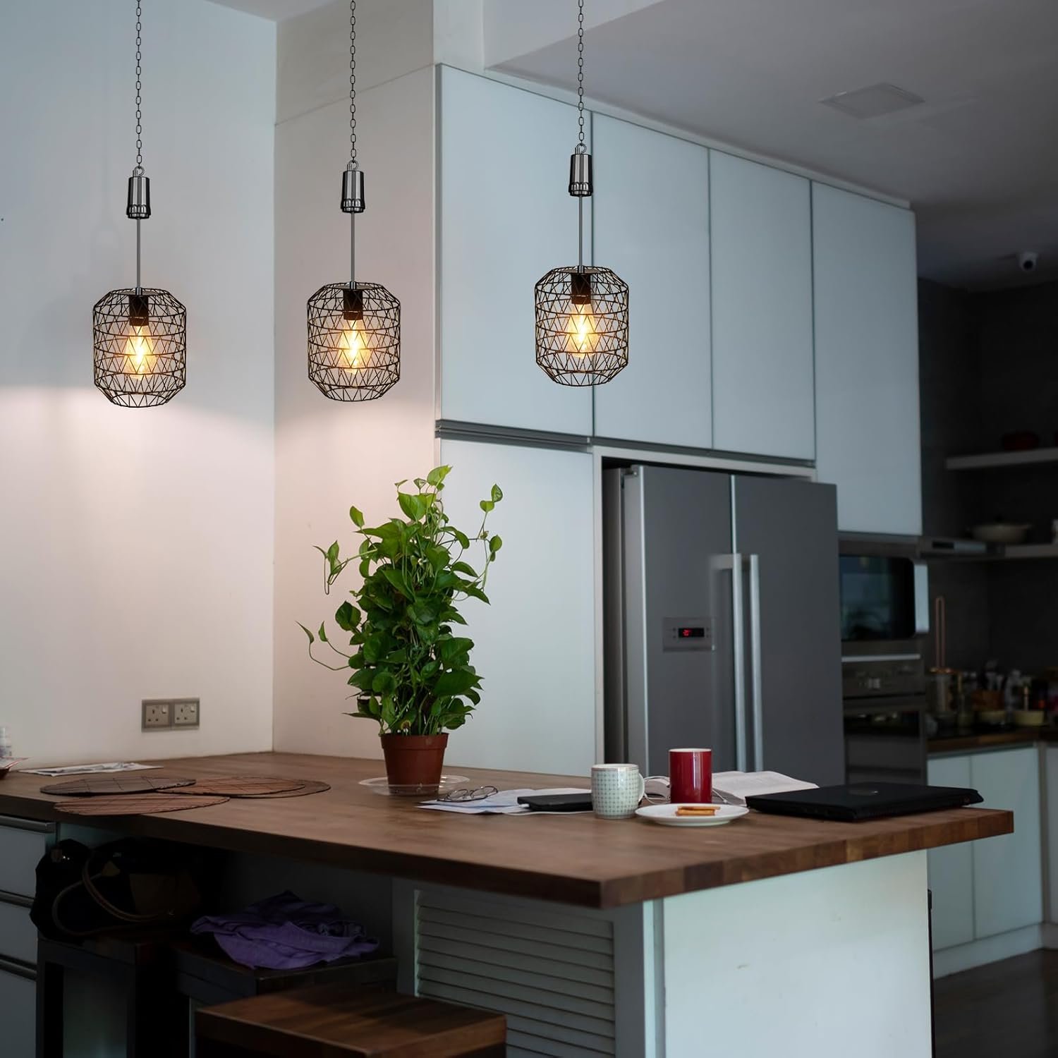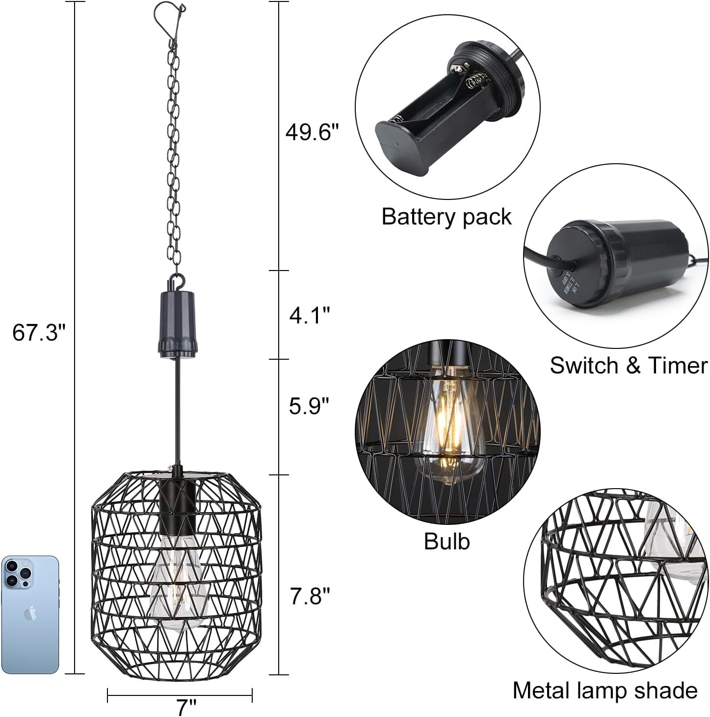 Battery-powered & timer unit: The battery operated pendant light and timer unit is powered by batteries(Not included). Measures 7.09×7.09×8.46 inches(Chain not included). The ON/OFF/Timer switch is on the cover of the battery box. Press the timer button to have 6 hours of light, so you don’t have to turn off the battery hanging light yourself.