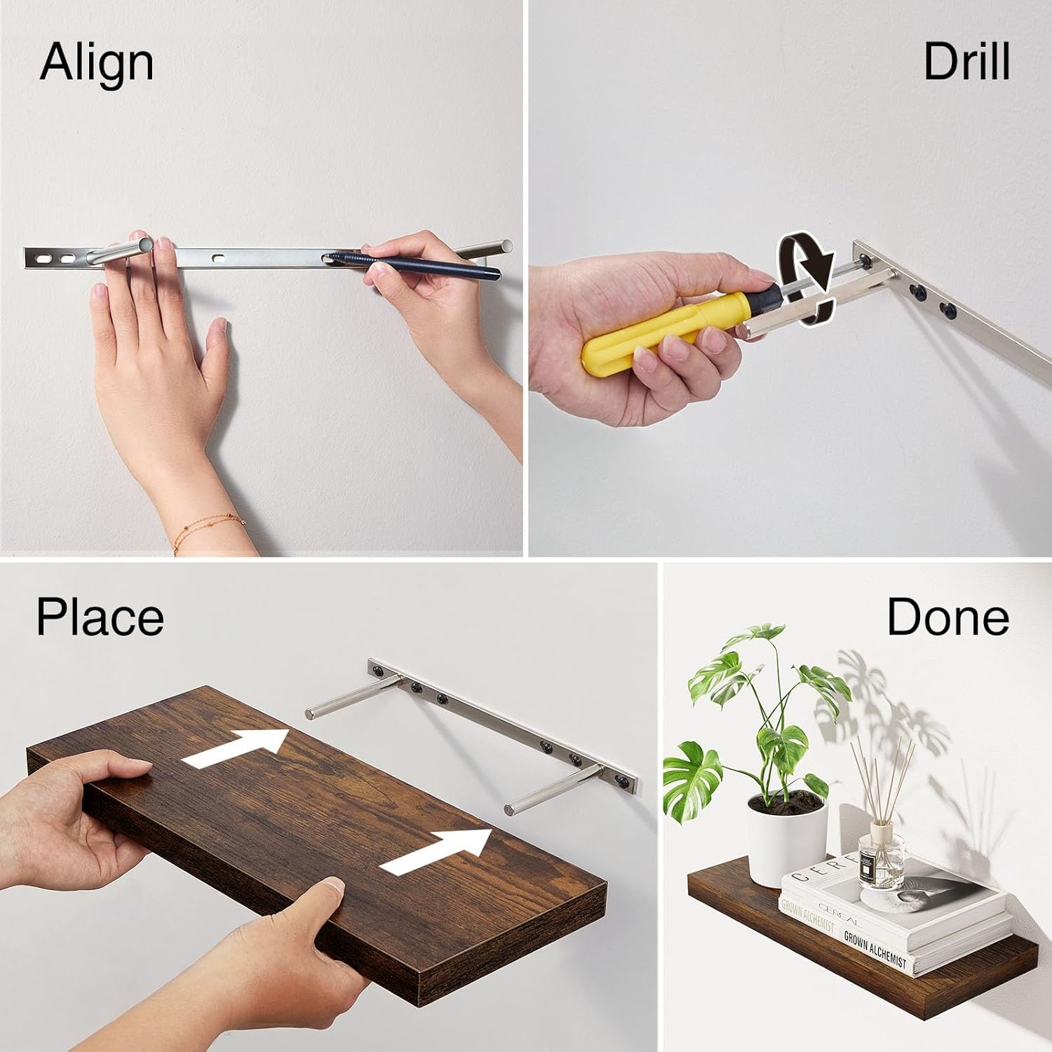 Customers find the floating shelves visually appealing with their rustic brown finish and simple design, and appreciate that they are easy to install with clear directions. The shelves receive positive feedback for their functionality, with one customer noting they work well in bathrooms. However, customers disagree on the shelves’ sturdiness, size, and value for money, with some finding them flimsy and too small, while others consider them great value. Additionally, customers report issues with the shelves tilting down and leaning forward.