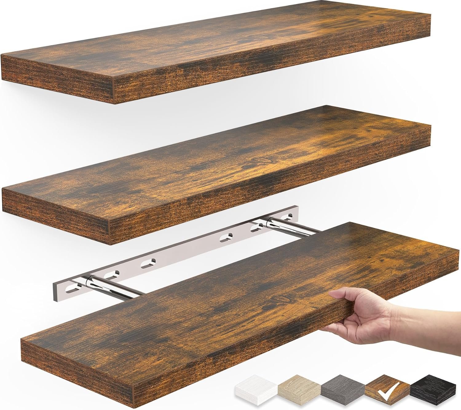 BAYKA Floating Wood Shelves – Wall Mounted for Bathroom,Bedroom,Living Room,Kitchen,Small Hanging Shelf for Books/Storage/Room Decor with 22lbs Capacity(Rustic Brown,Set of 3,15.7inch)
