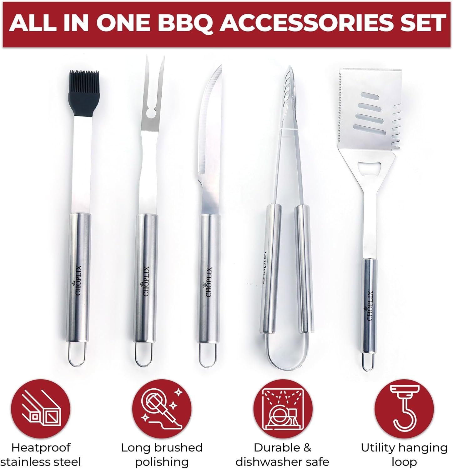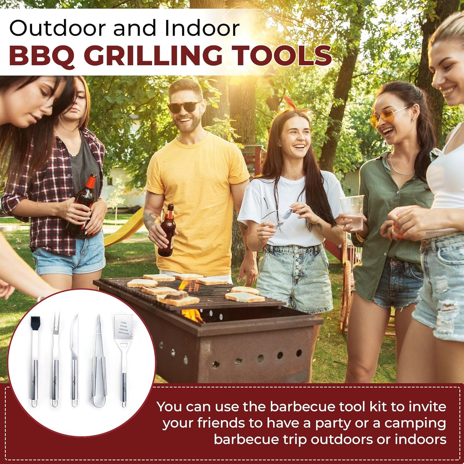 BBQMaster Elite 5-Piece Portable BBQ Tool Set – Spatula, Tongs, Fork, Basting Brush & Grill Brush in Aluminum Case for Outdoor Camping, Backyard Grilling & BBQ Accessories for Professional Use