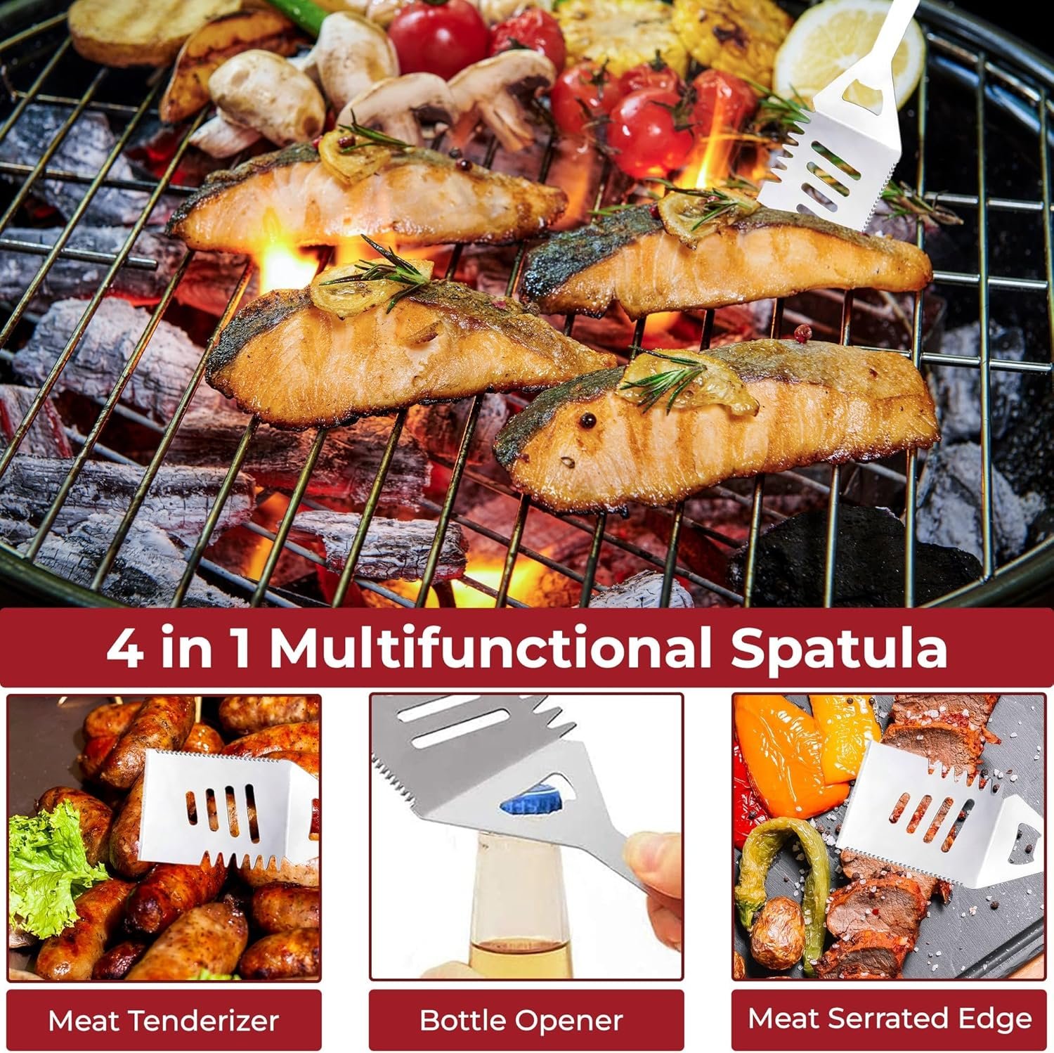 𝐄𝐑𝐆𝐎𝐍𝐎𝐌𝐈𝐂 𝐃𝐄𝐒𝐈𝐆𝐍 𝐅𝐎𝐑 𝐂𝐎𝐌𝐅𝐎𝐑𝐓: Each grill tool is thoughtfully designed with ergonomic handles that provide a comfortable and secure grip. These handles reduce strain during extended grilling sessions and offer easy handling, ensuring precision and control while flipping, cutting.