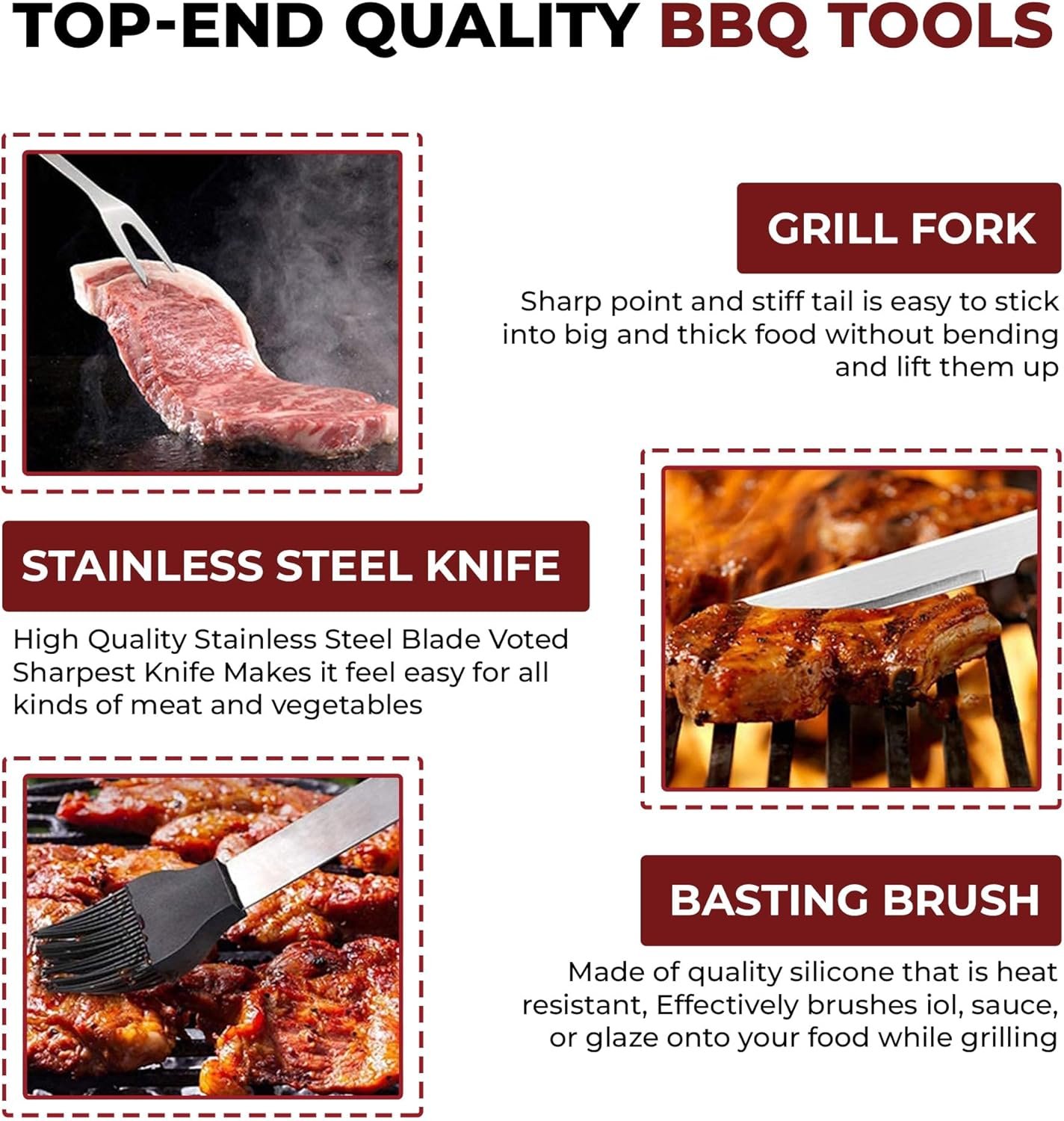 𝐏𝐑𝐄𝐌𝐈𝐔𝐌 𝐒𝐓𝐀𝐈𝐍𝐋𝐄𝐒𝐒-𝐒𝐓𝐄𝐄𝐋 𝐂𝐎𝐍𝐒𝐓𝐑𝐔𝐂𝐓𝐈𝐎𝐍: Each tool in the set is meticulously crafted from premium-quality stainless steel, ensuring superior durability and resistance to rust. These sturdy tools are built to last and provide reliable performance for all your grilling adventures.