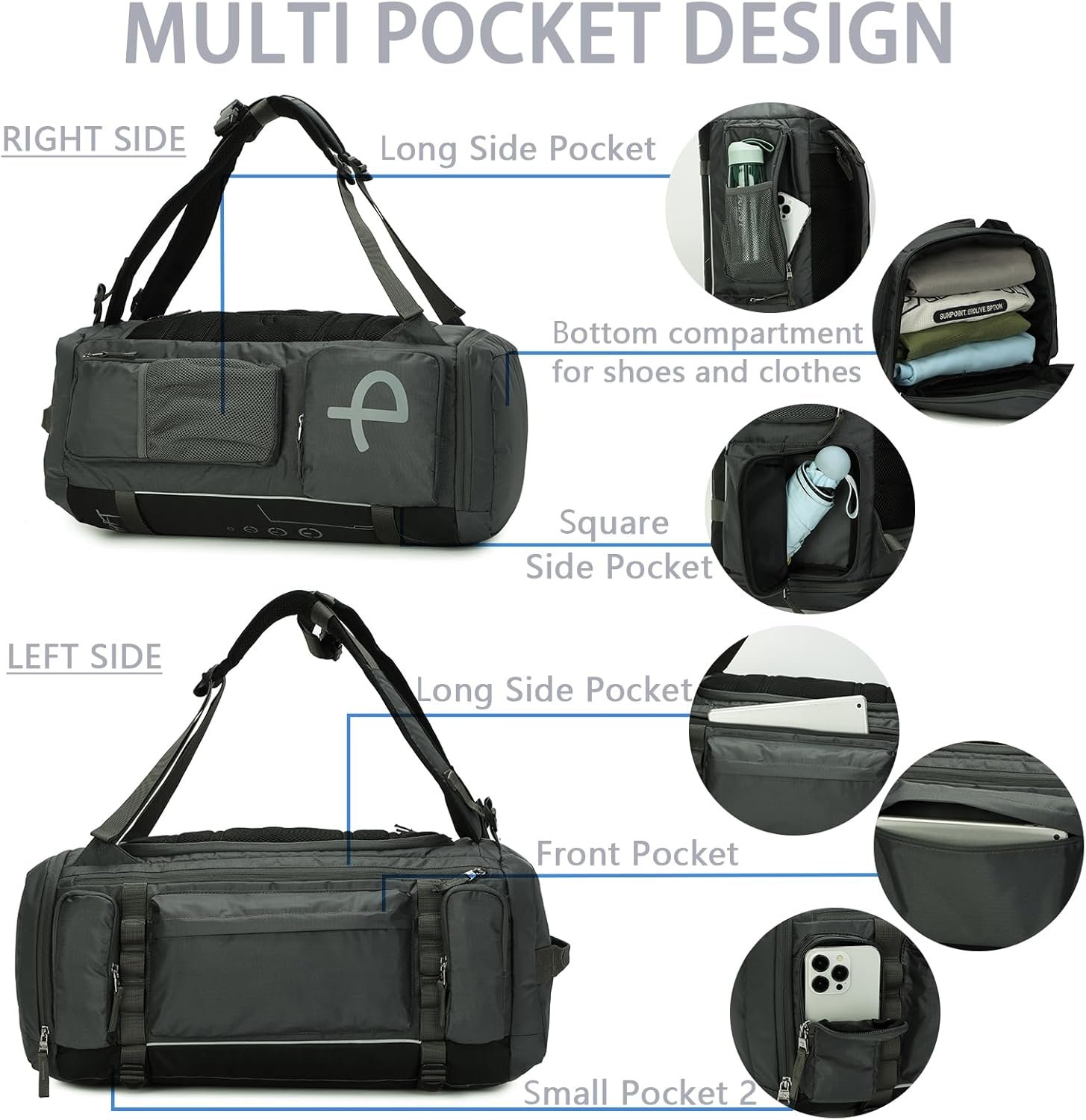 ⭐【High-quality Material & Perfect Size】👍 This gym backpack dimensions when full:15.8*8.5*22.5 inch / 40*21.5*57 cm (H*W*H), with 50L capacity. The gym bag feature double handles and shoulder straps designed to relieve pressure. This backpacks is made of high quality tear and waterproof fabric so you don’t worry about your item from getting wet. Double zipper, smooth and wear resistant.