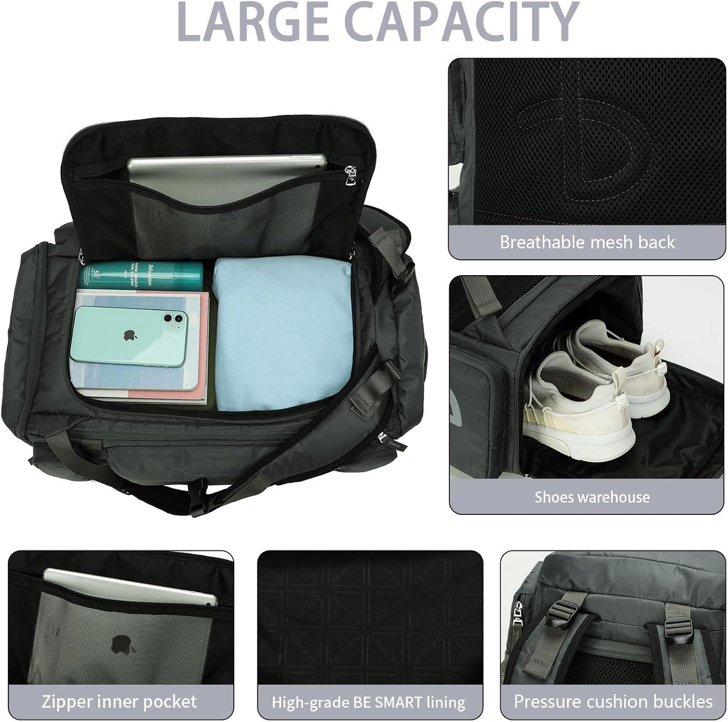 BE SMART 50L Extra Large Gym Backpack for Men, Big Gym Bag with Shoes Compartment, Waterproof Heavy Duty Duffel Bags, Men’s Workout Backpacks for Outdoor Sport,Hiking,Camping,Travel