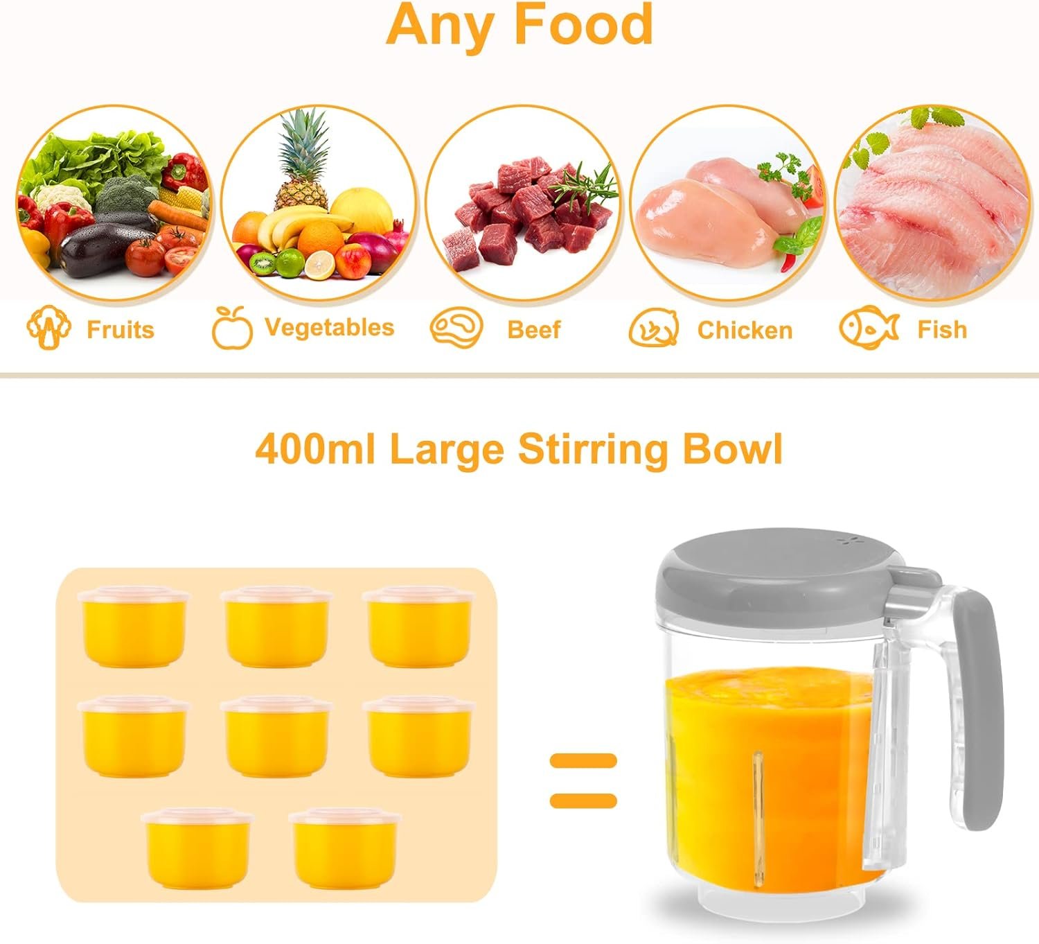 【Easy to Use & Clean】Baby food blender is equipped with 400 ml mixing bowl and 4 high-quality precision blades running at 2875R per minute to cook baby food in minutes. Its self-clean function is the perfect time saver for every busy mom, just add some clean water and the machine will do the rest! NOTE: Keep appliance empty an d dry when not in use