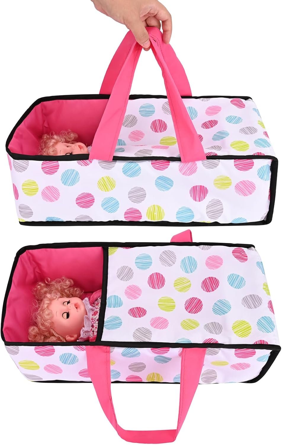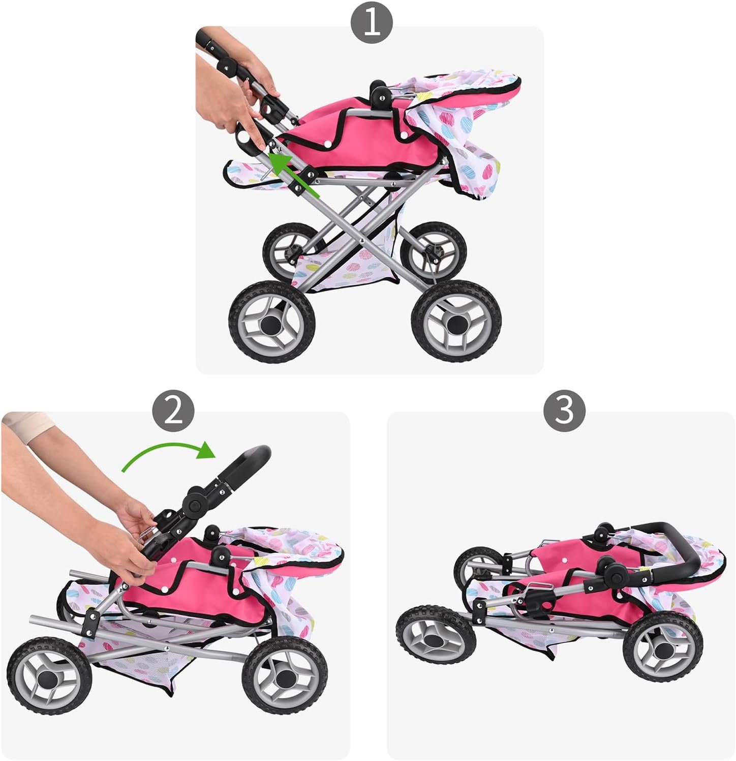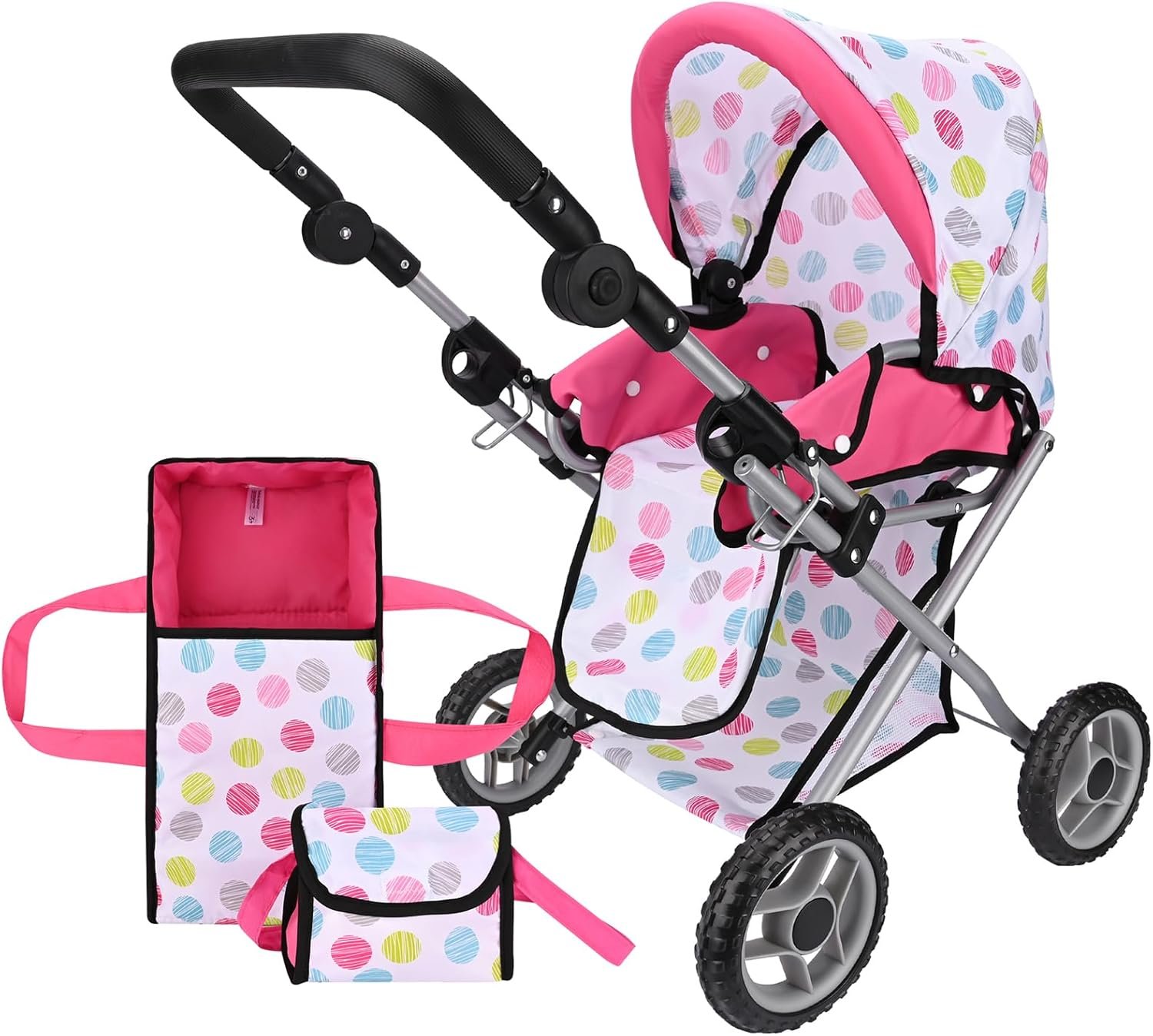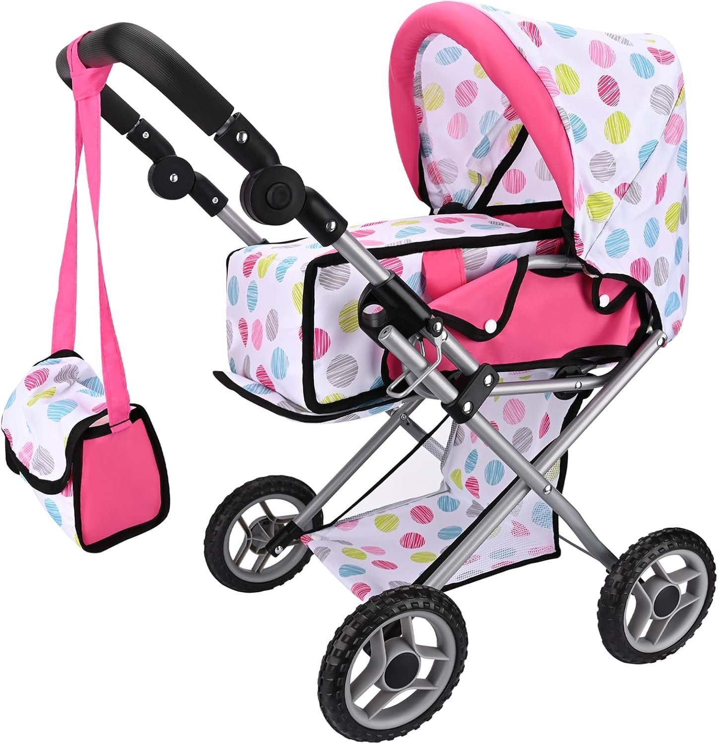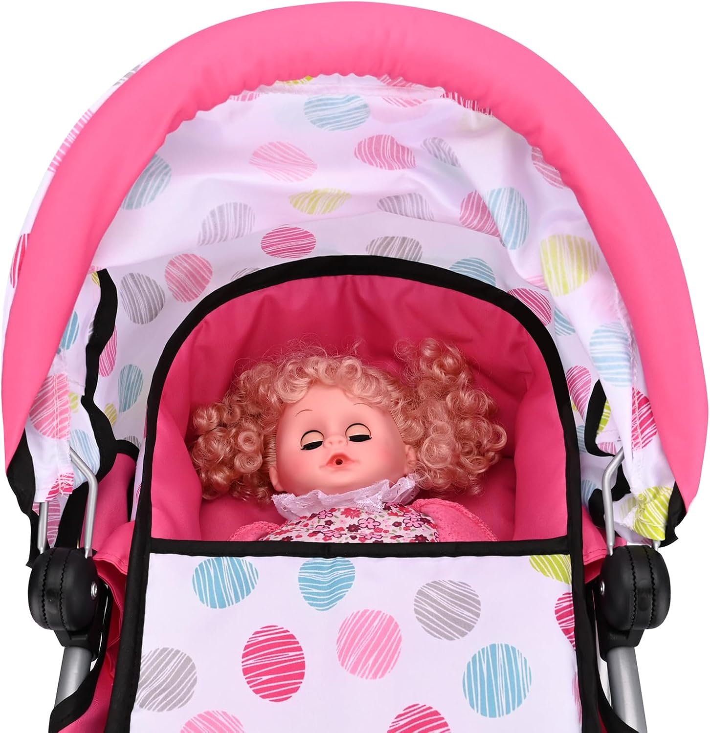 PUSH YOUR DOLL IN STYLE: Features a classic pram style with a cute polka dot pattern, blending traditional elegance with a modern twist.