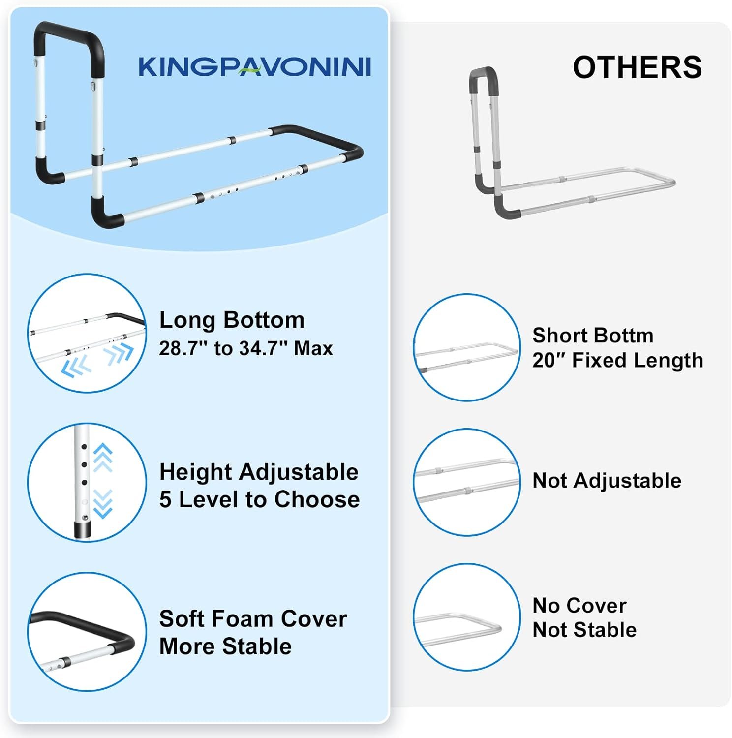 3D Adjustable: The KingPavonini bed assist rail is height adjustable from 17.7 to 20.5 inches, fits mattresses 8 to 15 inches tall, and can extend from 28.7 to 34.7 inches in the horizontal direction for added safety and a more customized fit. It can be used on Twin, TwinXL, Full, Queen, and King size beds.