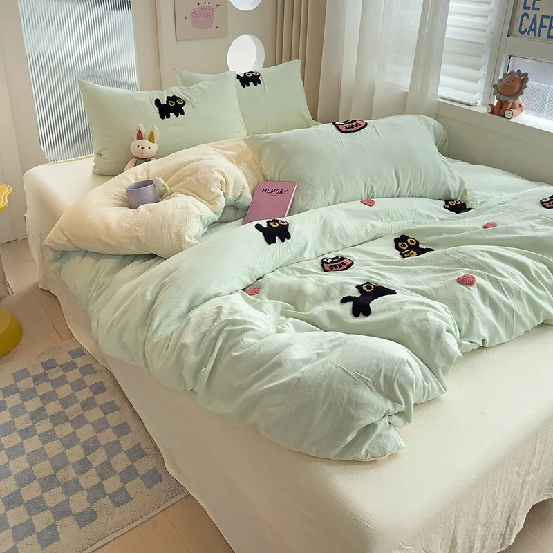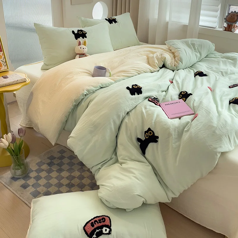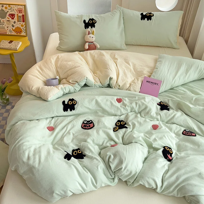 Bedding Set 2024 New Four Seasons Super Soft Washed Cotton Towel Embroidery Duvet Cover Four Piece Set – Lucky Cat Series