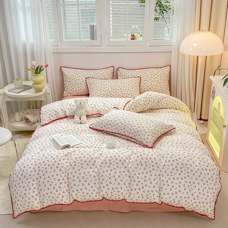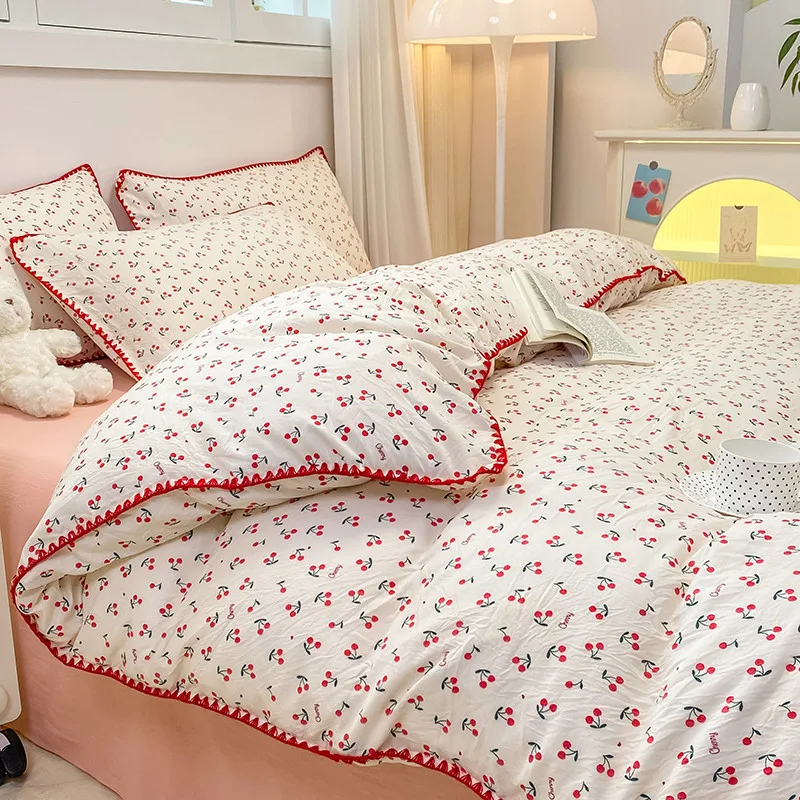 Bedding Set INS Girls Cherry Soft Washed Cotton Bed Sheet Queen King Size Duvet Set Comforter Set Pillowcase Bed Linens