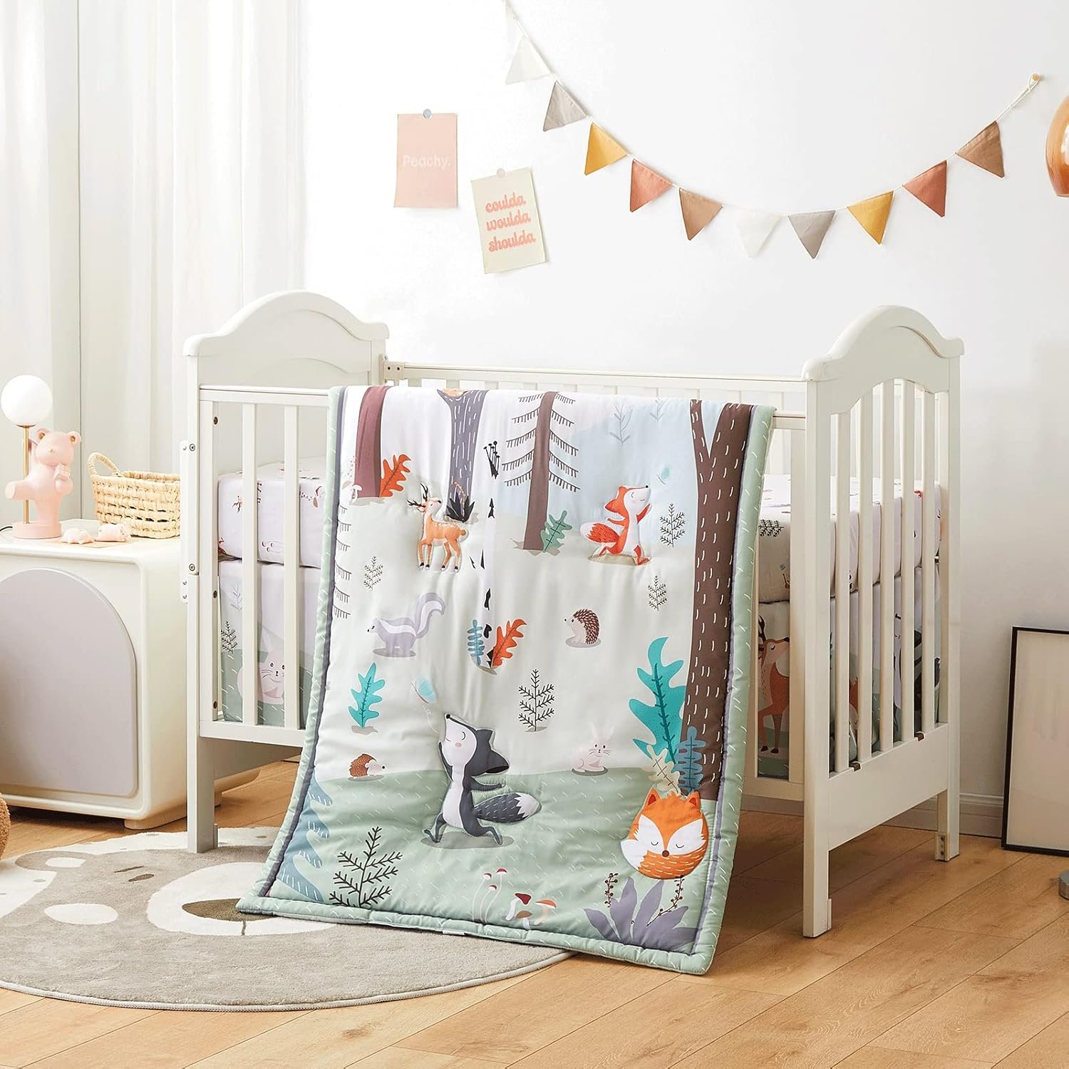 beeweed 3-Piece Crib Bedding Set for Boys Girls, Soft Baby Bedding Set Including Blanket, Crib Skirt & Crib Sheets, Woodland Animal Nursery Bedding Set