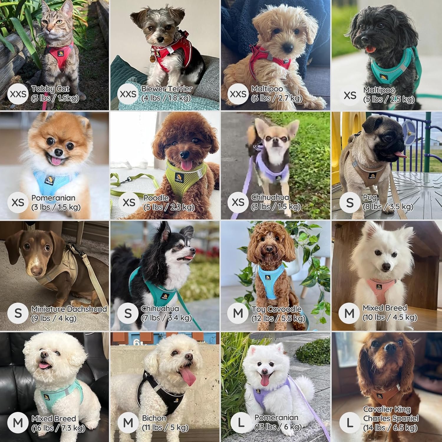 【Breathable Air Mesh】The puppy harness are made with soft mesh fabric, it’s lightweight but sturdy, easy to clean and quick-dry. The step in harness design make the pulling pressure distributed to the body to prevent choking.
