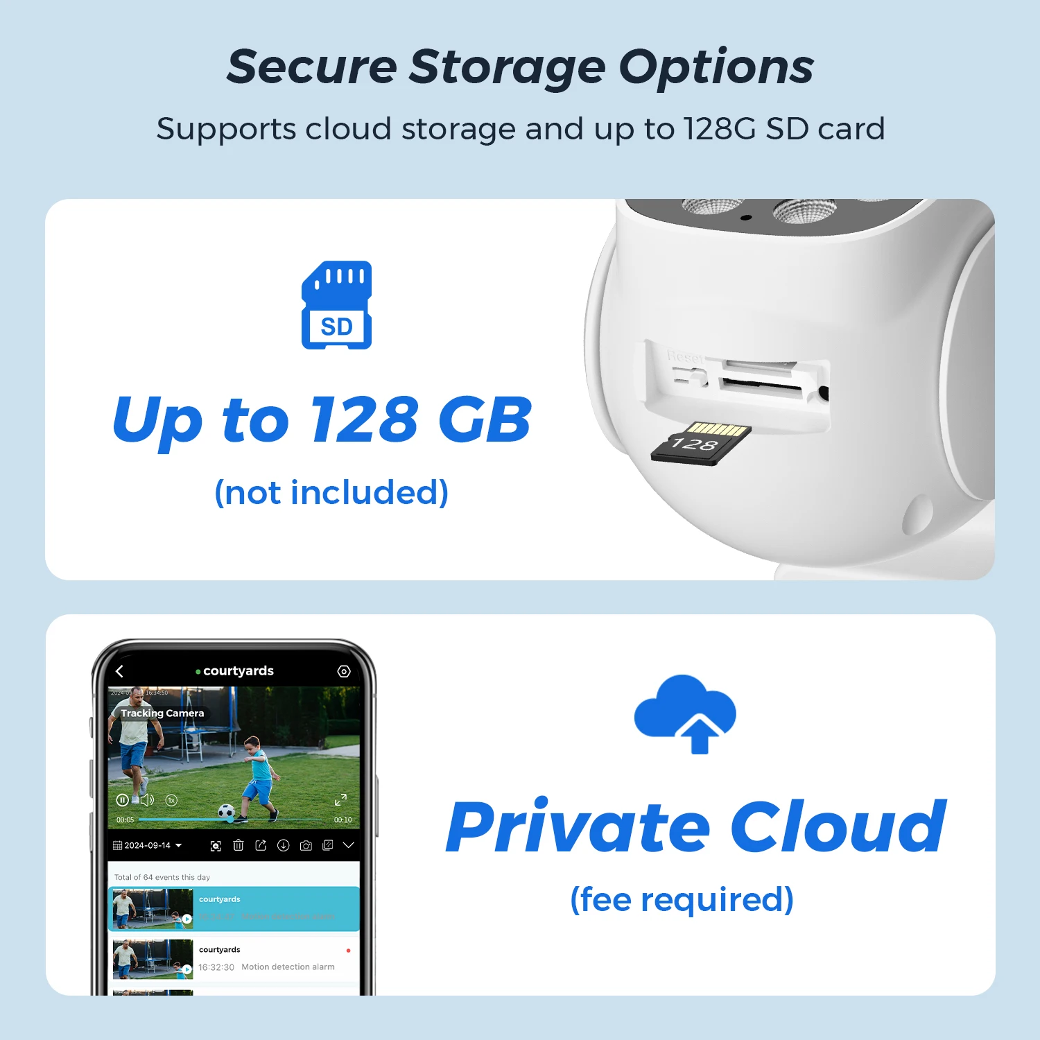 Supports TF storage, up to 128GB memory card. First month cloud storage free experience, support online paid purchase in iCsee App, never worry about losing important videos again.