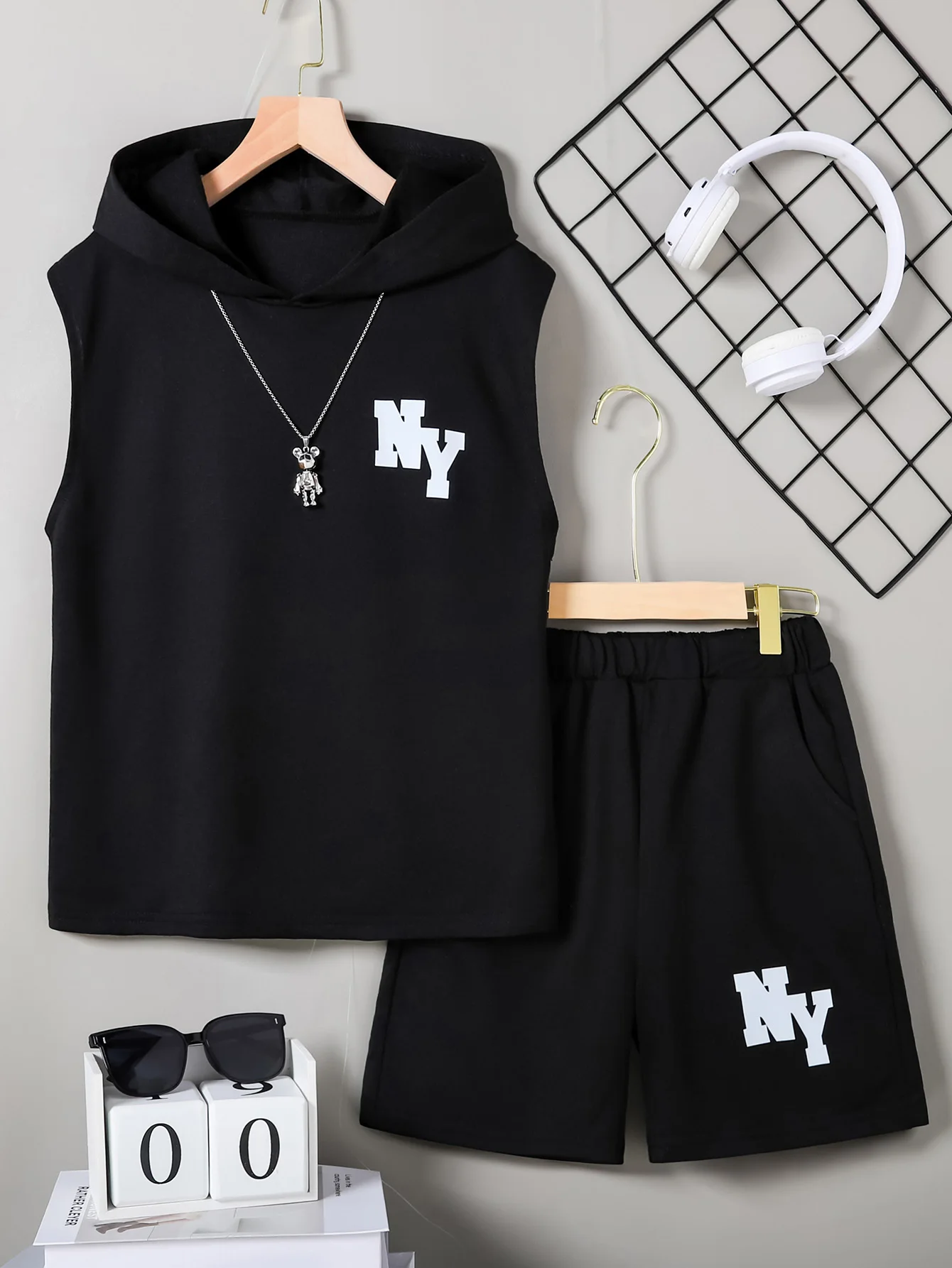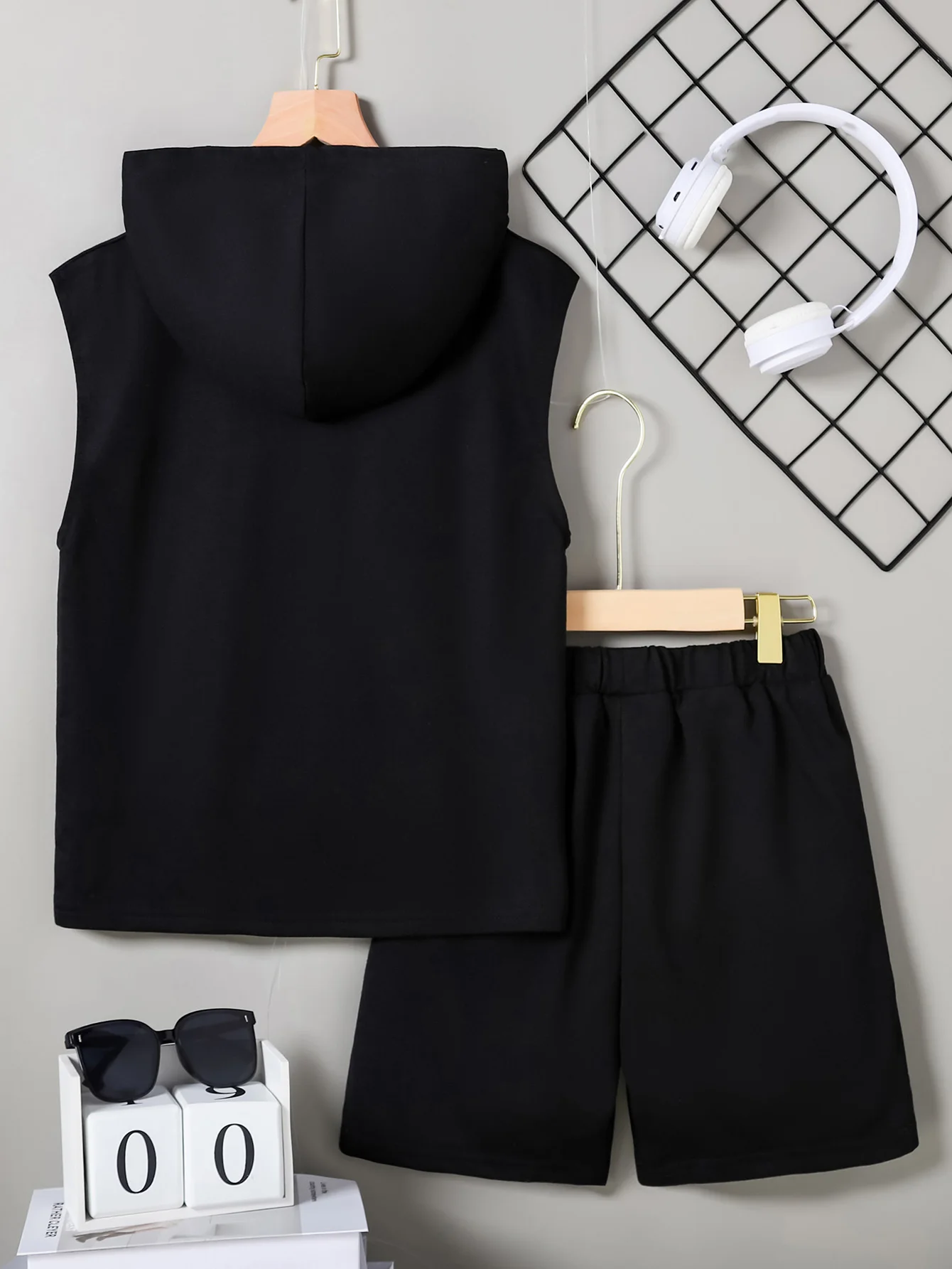 Best-Selling New Style Boys’ Letter Printed Sleeveless Hooded Tops, Shorts, Sportswear Suits, Casual Style