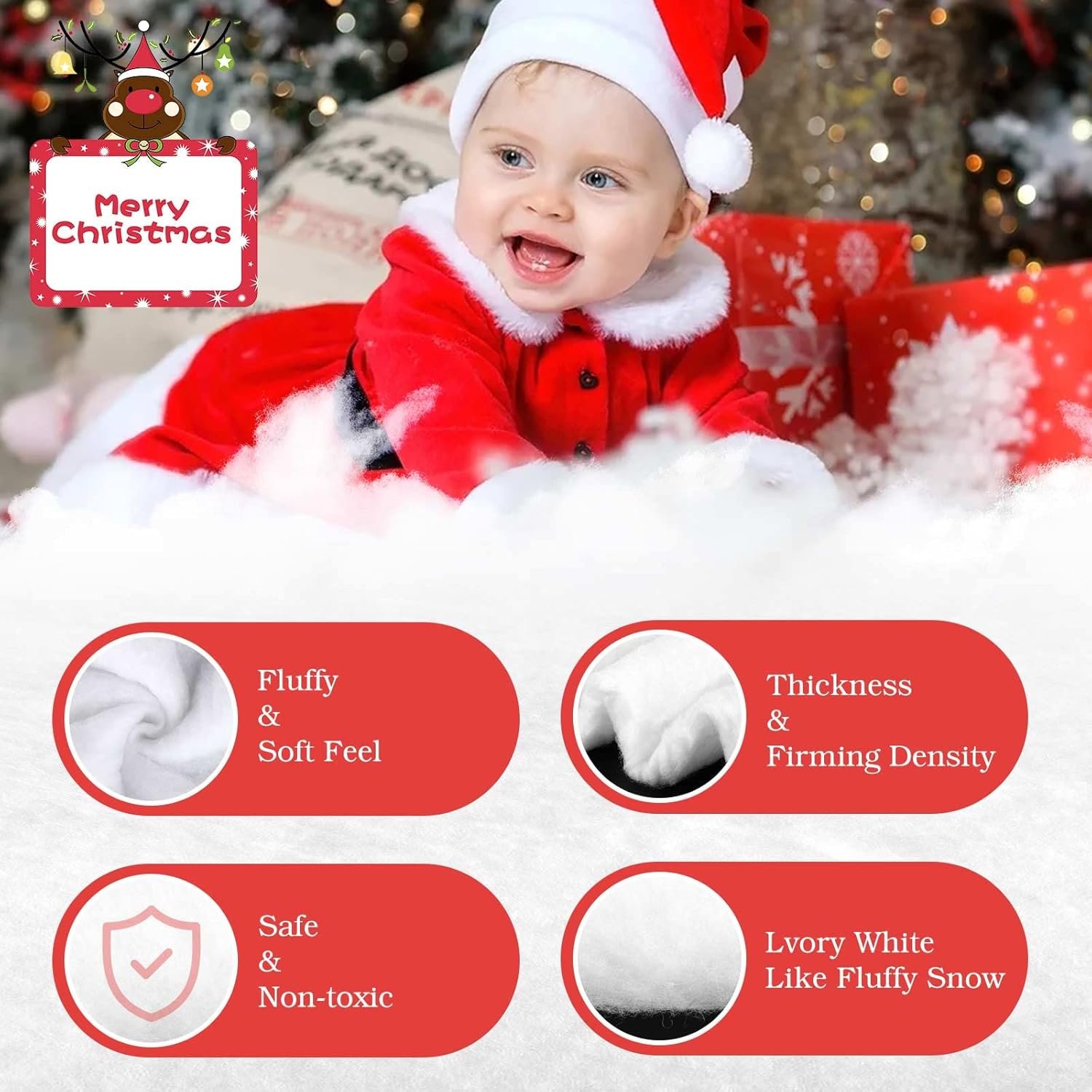❄【High Quality & Kid-Safe】Our soft Christmas snow blanket carpet rolls and fake snow fluffy decor are made of high-quality, soft, reusable, flame retardant,durable and non-toxic bright white cotton material, withstand tearing, snagging and fraying, which can reuse few Christmas seasons, also safe for kids and pets. This artificial snow set in vacuum pack, you can place it about 2 hrs return to the original shape before use, no worry about affect your use. Easy to clean up and simple to reuse.
