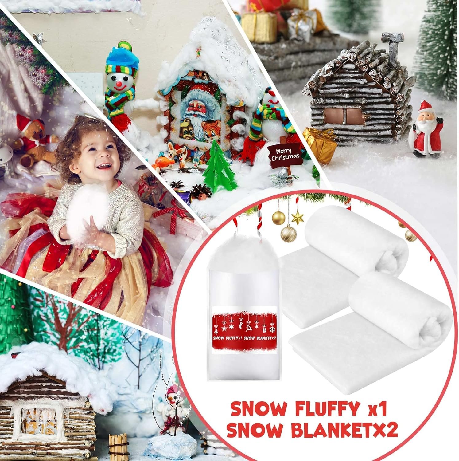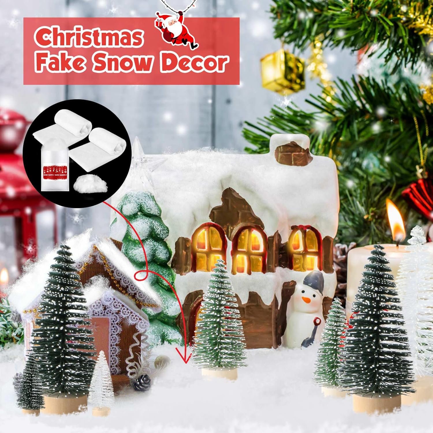 18OZ Christmas Fake Snow Decor Artificial Snow+2 Pack Christmas Snow Roll 3Ft x 8Ft Blankets for Christmas Decorations Mantle Christmas Village Display Like Fluffy Snow with 36pcs Mini Christmas Trees