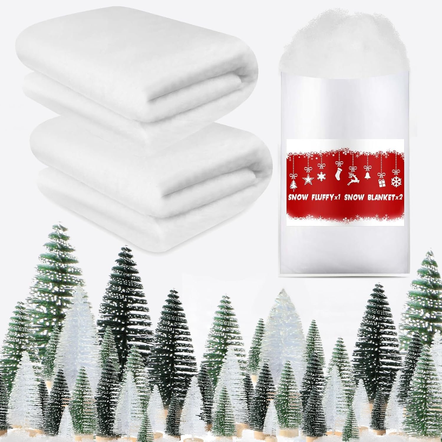 BESTEEL 2 Pack Christmas Snow Roll and 3 Foot X 8 Foot Artificial Snow Blanket and 18OZ Fake Artificial Fluffy Decor for Christmas Decoration Village with 36pcs Mini Trees