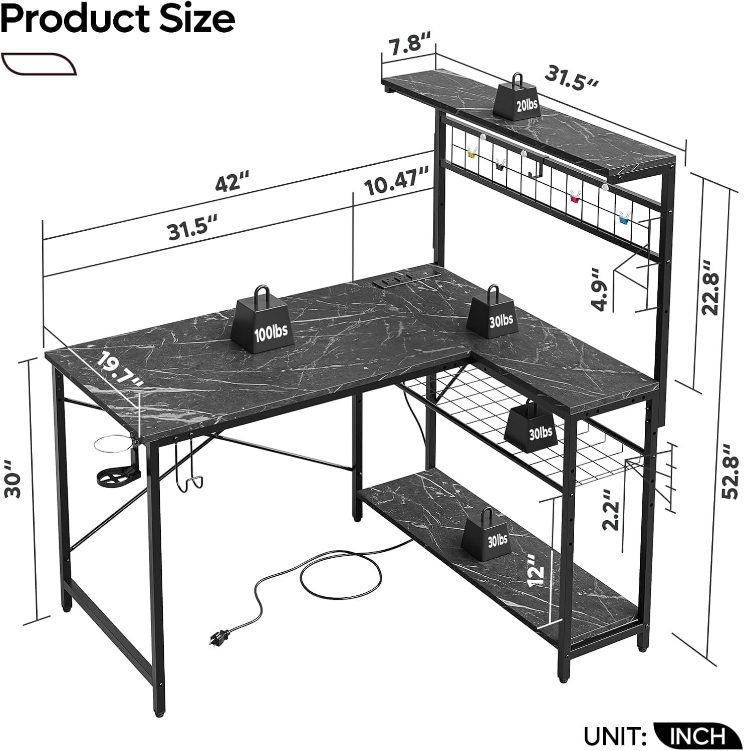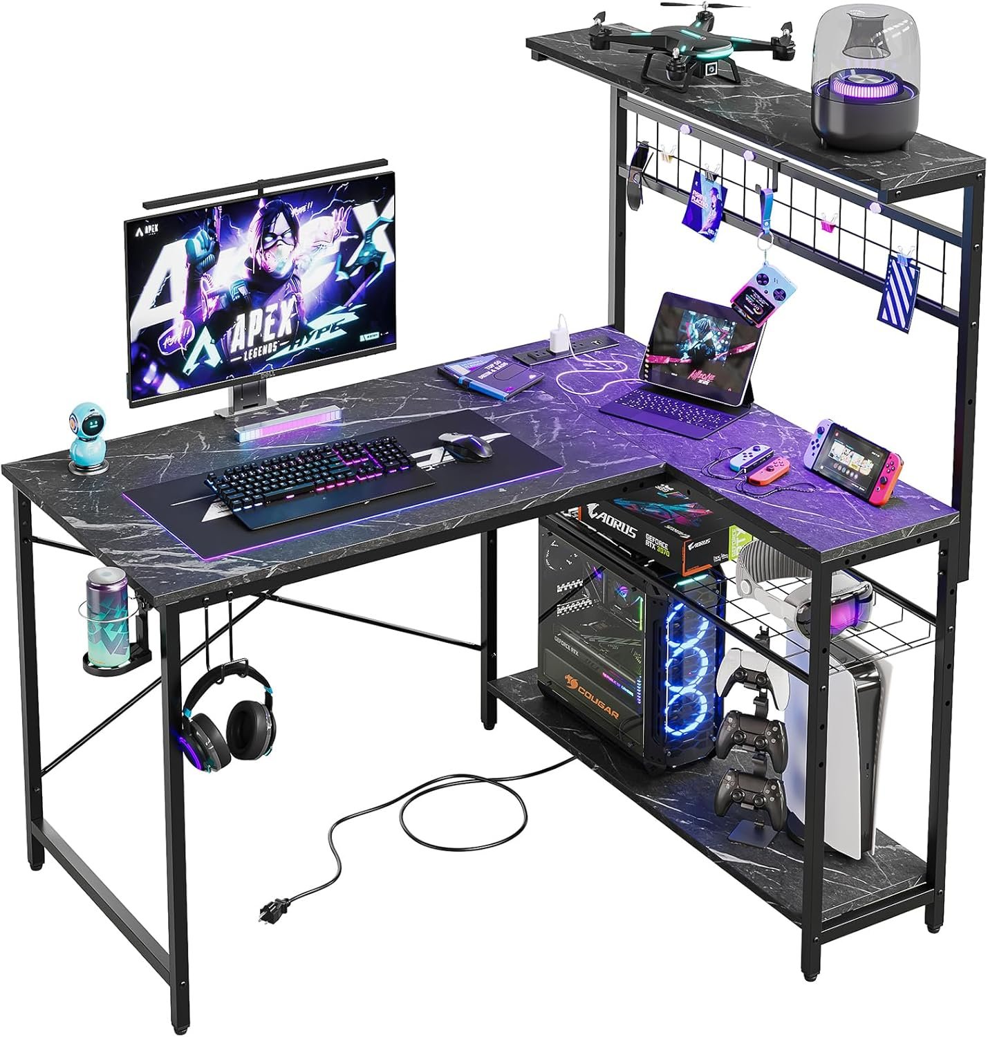 Bestier 42 L Gaming Desk,Computer Desk with Power Outlets, LED Lights, Reversible Corner Desk with 4-Tier Shelves,Cup Holder & Hook Black Marble