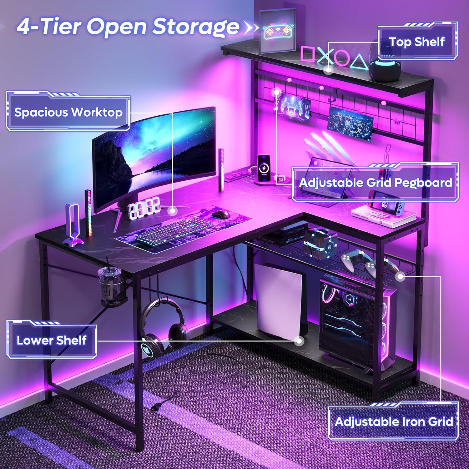Maximize Your Gaming Experience: Bestier L-shaped gaming desk with top hutch offers ample workspace and versatile 4-tiered storage for efficient organization and enhanced productivity. Elevate your gaming setup with this stylish workstation featuring a convenient hook, binder clips, and magnetic pieces for tidy display of your gaming essentials.