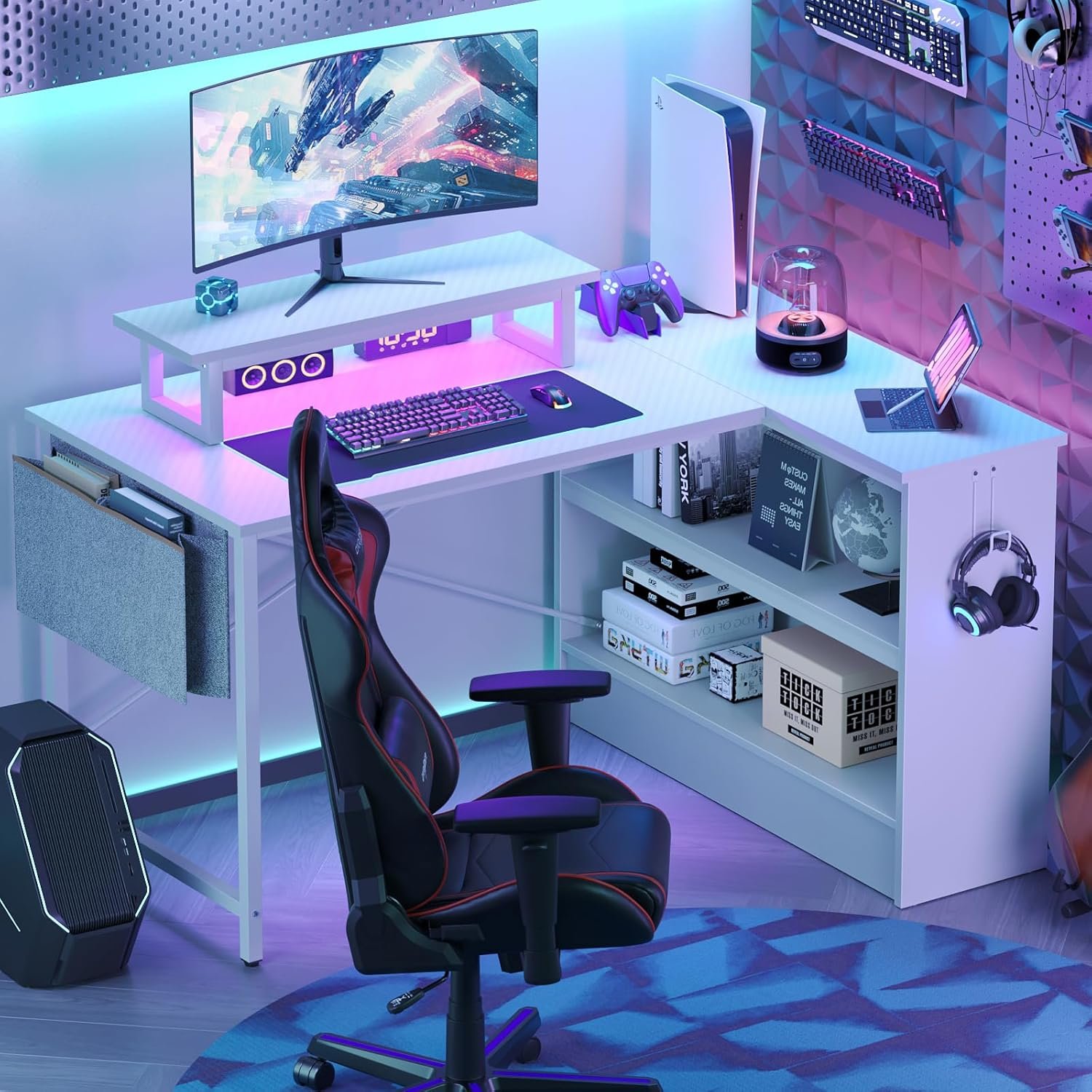 Bestier L Shaped Gaming Desk with LED Lights, 42 Inch Computer Desk with Monitor Stand & Open Storage Cabinet,Writing Study Corner Desk for Home Office Bedroom, White