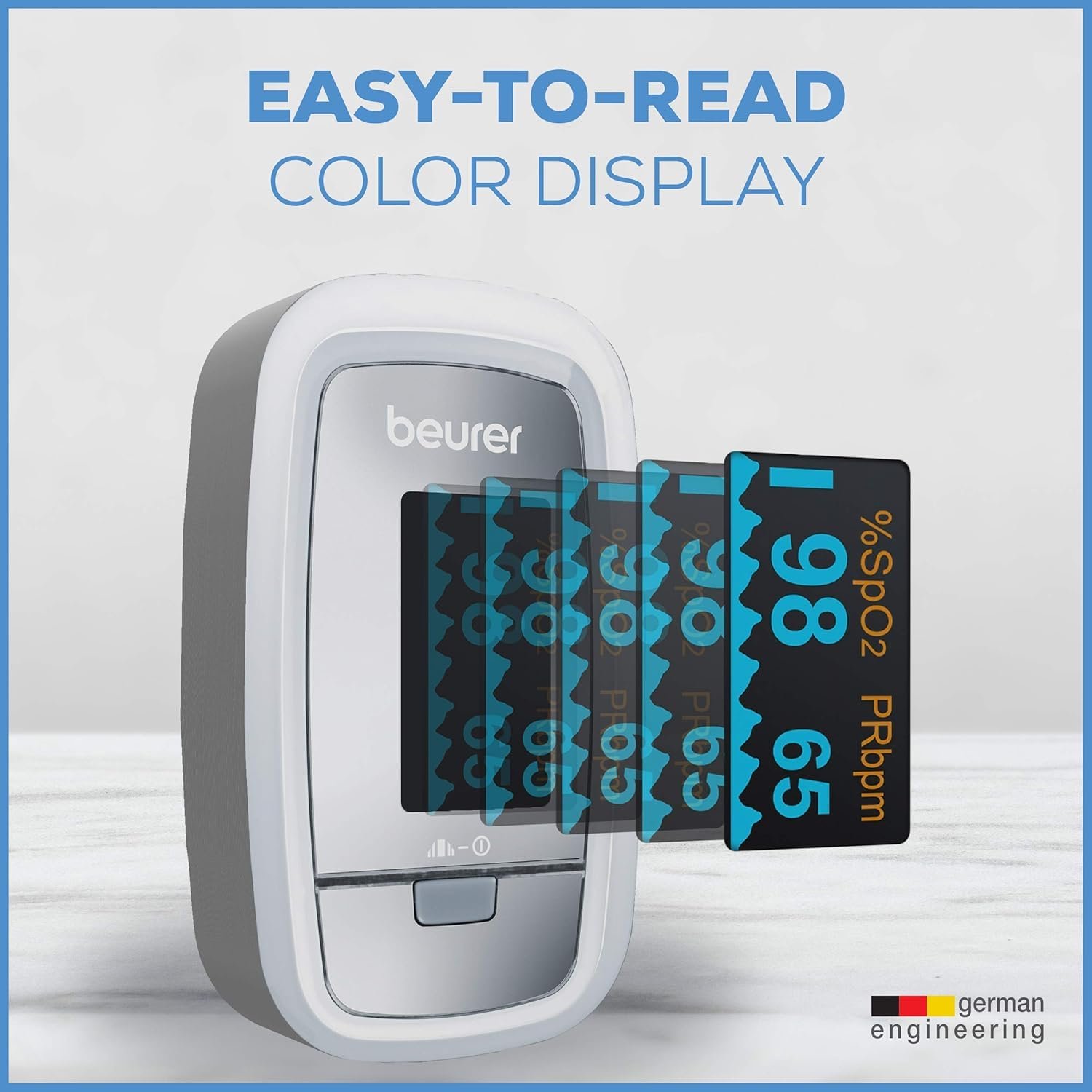 Beurer PO30 Fingertip Pulse Oximeter, Pain Free Blood Oxygen Saturation & Heart Rate Monitor with 4 Display Options, Lanyard, Storage Bag & Batteries Included
