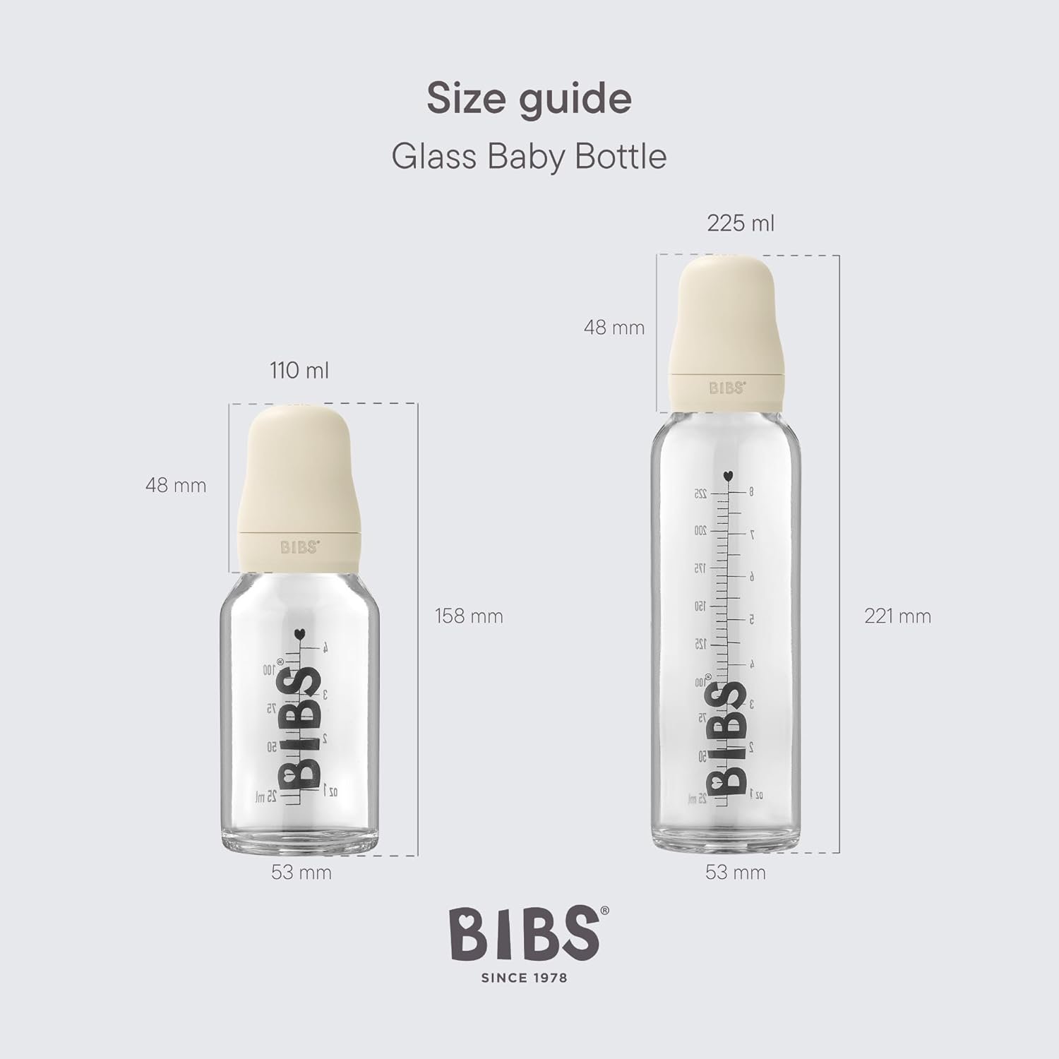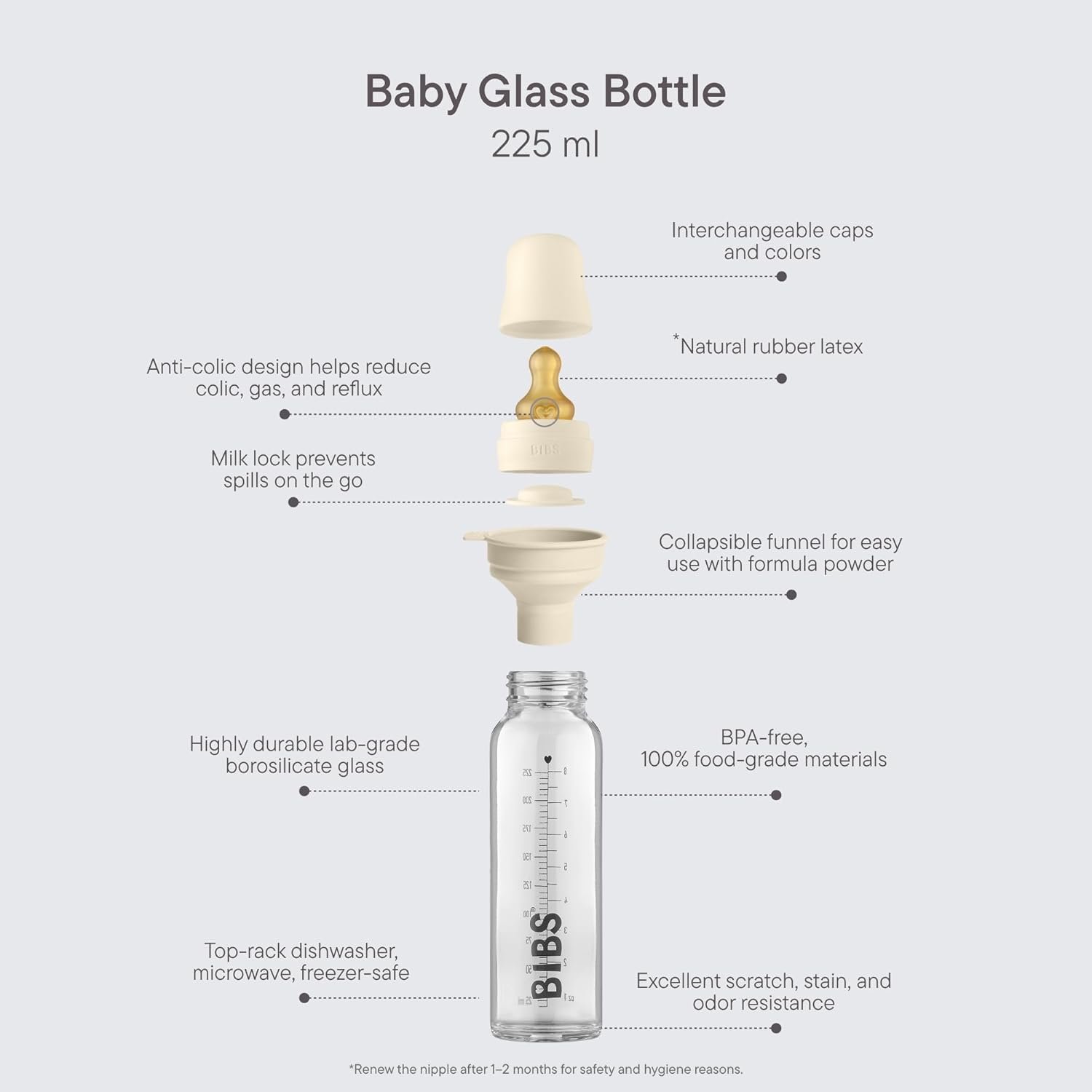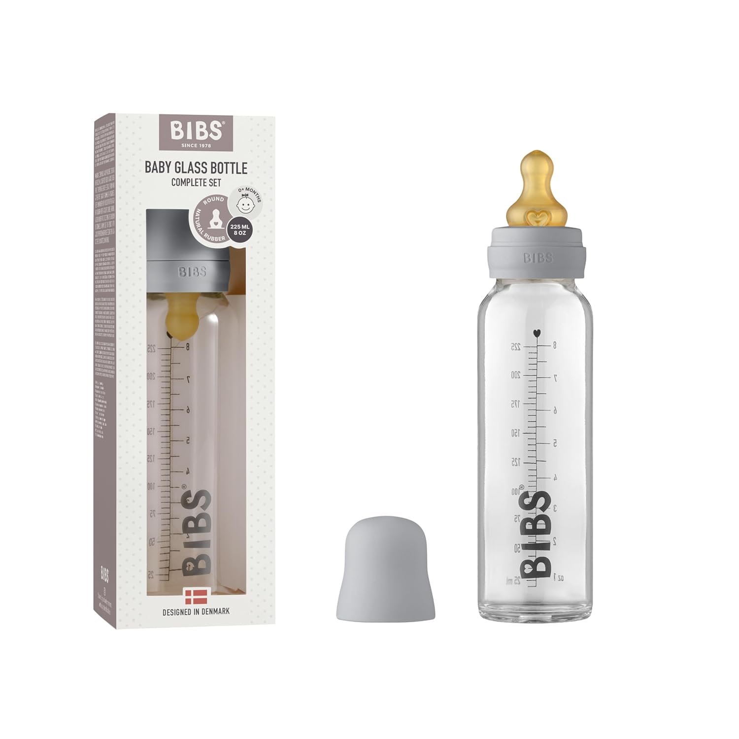 BIBS Baby Glass Bottle. Anti-Colic. Round Natural Rubber Latex Nipple. Supports Natural Breastfeeding, Complete Set – 225 ml, Cloud