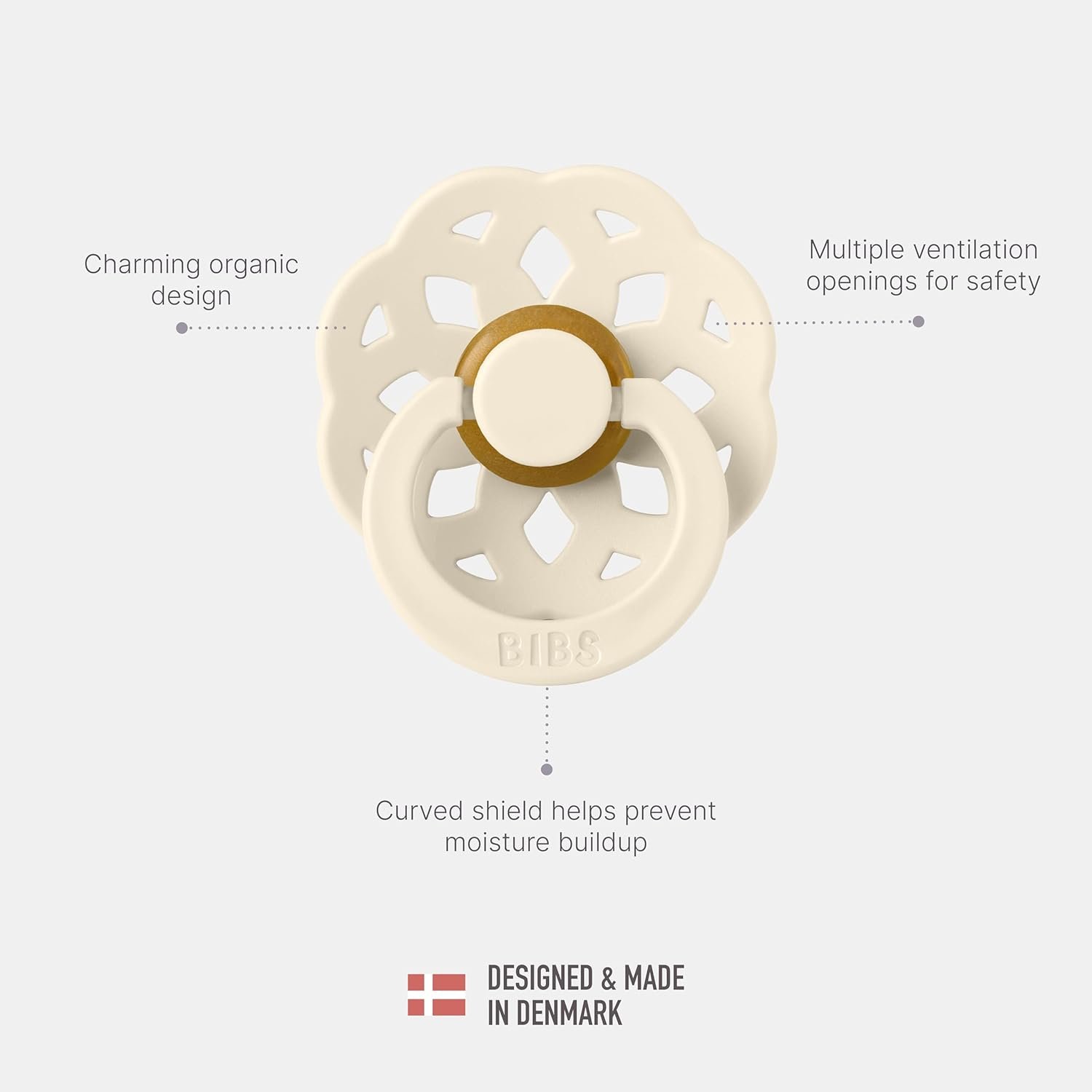 BIBS Boheme takes inspiration from the modern bohemian style with a deep appreciation for mother nature. The bohemian style combines natural elements like wood, rattan, and macrame with artistic, quirky, and organic patterns making this new design fresh, creative, and super cute. KEY TAKE AWAY Unique bohemian-inspired BIBS pacifier with a round nipple. The round soft natural rubber nipple is recommended by midwives to support natural breastfeeding. Round lightweight shield made of 100% safe and food-grade material Polypropylene (PP). Available in a large range of the most popular BIBS colors. Complies with the European Standard EN 1400+A2. Designed and made in Denmark/EU.