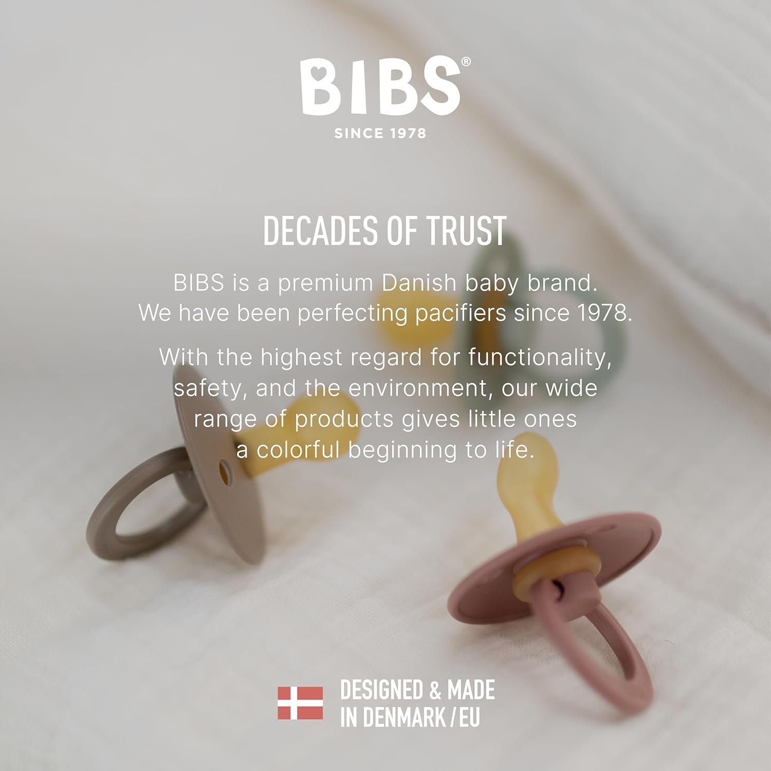 Legacy of Quality: With over 40 years of experience, BIBS is a trusted brand, renowned for providing high-quality, durable pacifiers. Each product reflects a commitment to safety and comfort, embodying a legacy of Danish design and craftsmanship.