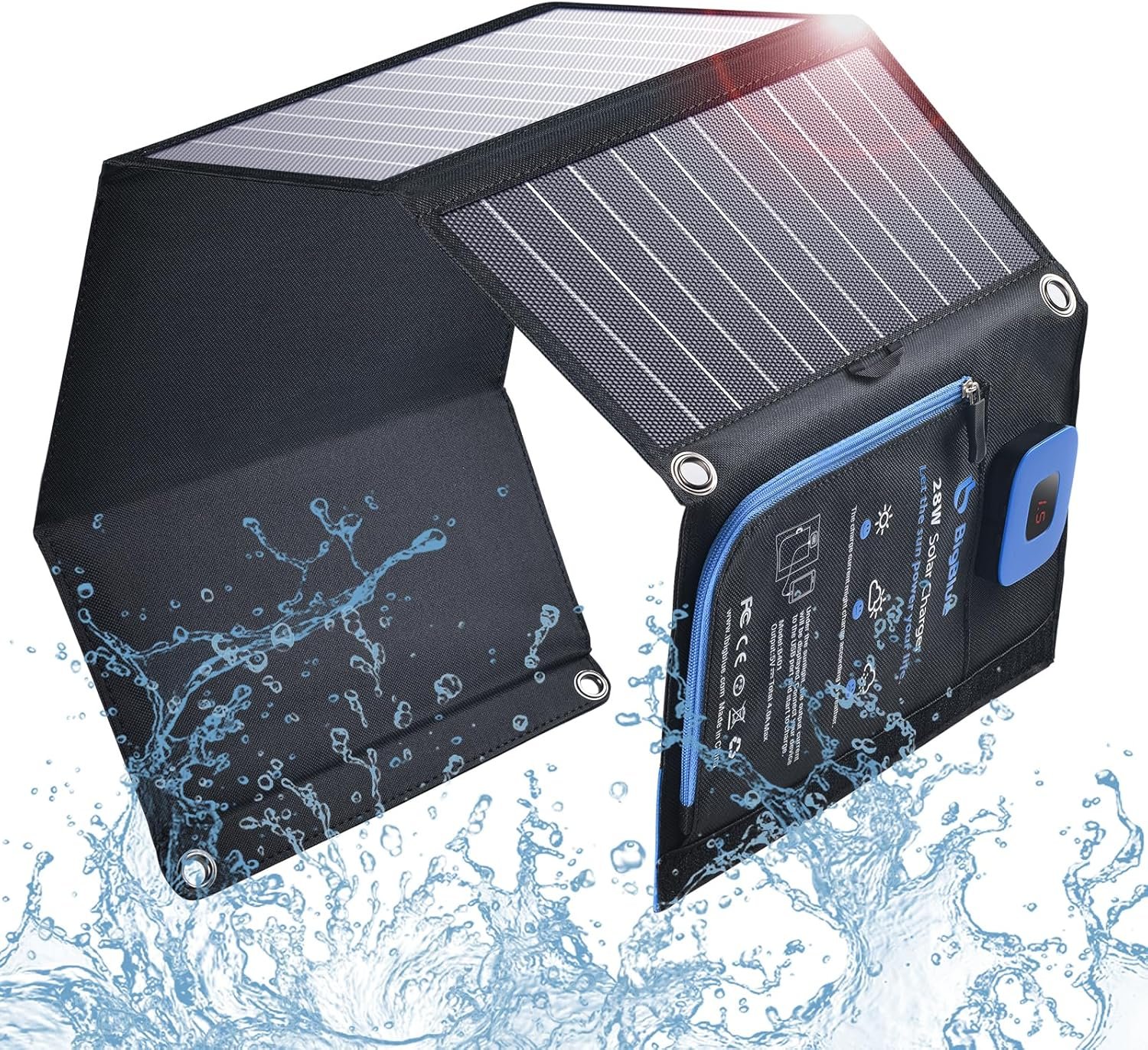 BigBlue Portable Solar Charger 28W with Digital Ammeter, 25.4% High-Efficiency, Dual USB Ports, Folding Waterproof Solar Panels with Carabiners for Camping, Backpacking, Phones, Tablets, Power Bank