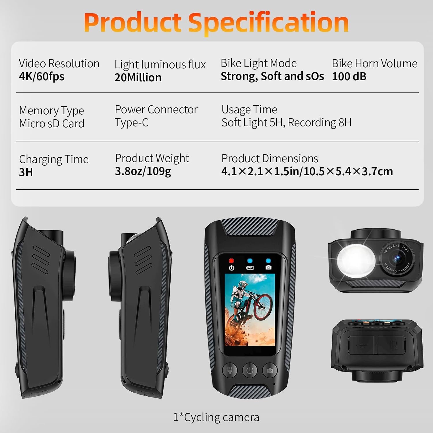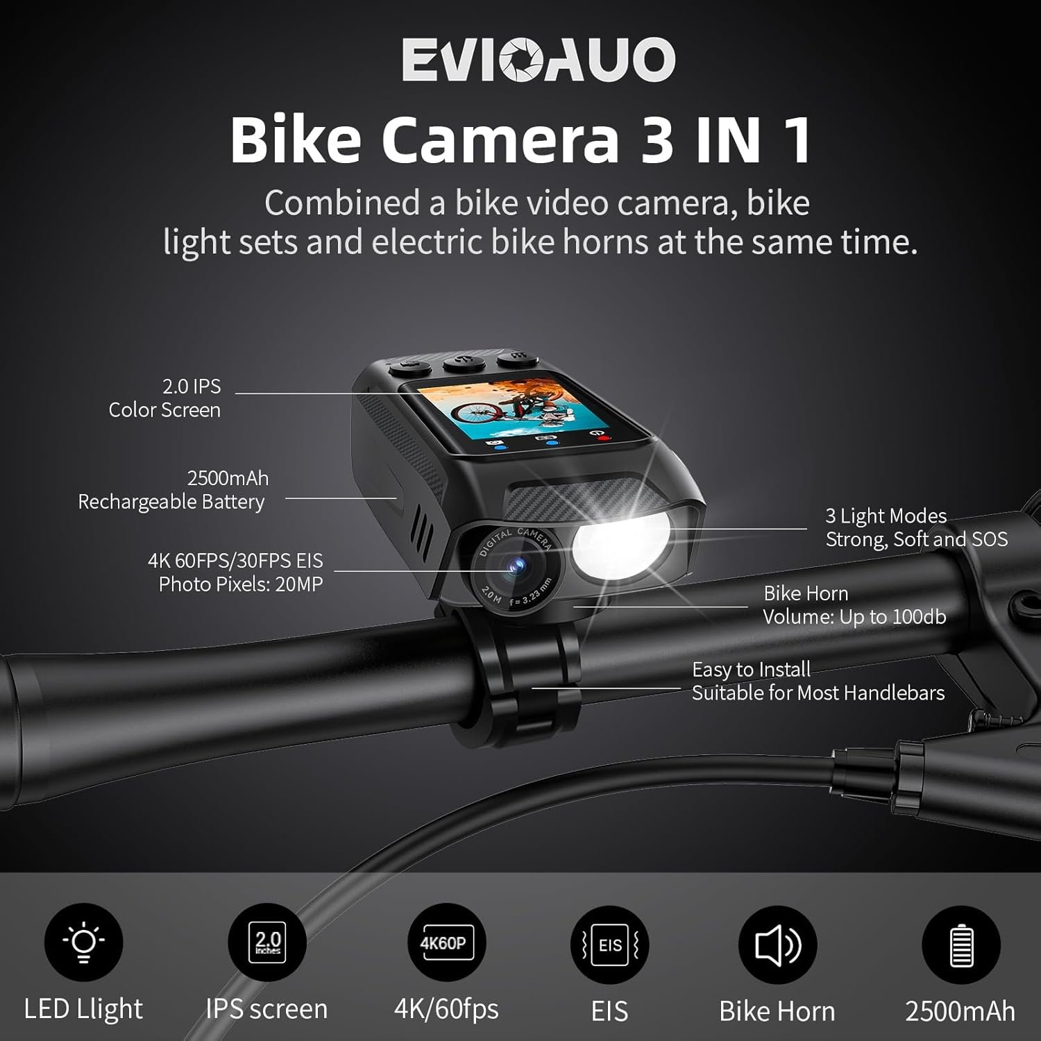 Bike Camera Bicycle Video Cameras Recorder Action Cameras 4K 30fps EIS 40MP, Vlogging Cameras Bike Lights Sets Electric Bike Horns 3 in 1, Sports Cameras w/32G Memory Card