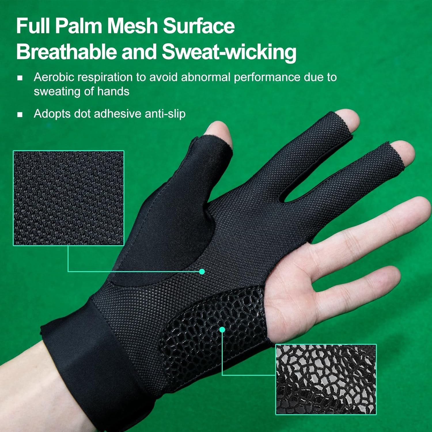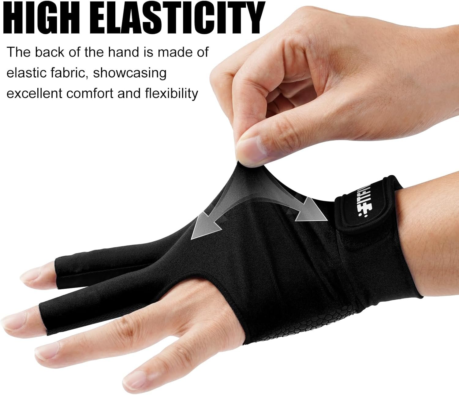 Soft and Comfortable Back: This billiard glove is made of premium elastic Lycra fabric, which is comfortable and skin-friendly with high elasticity and wrinkle resistance. The smooth back of the glove allows for effortless cue strokes during your billiard game.