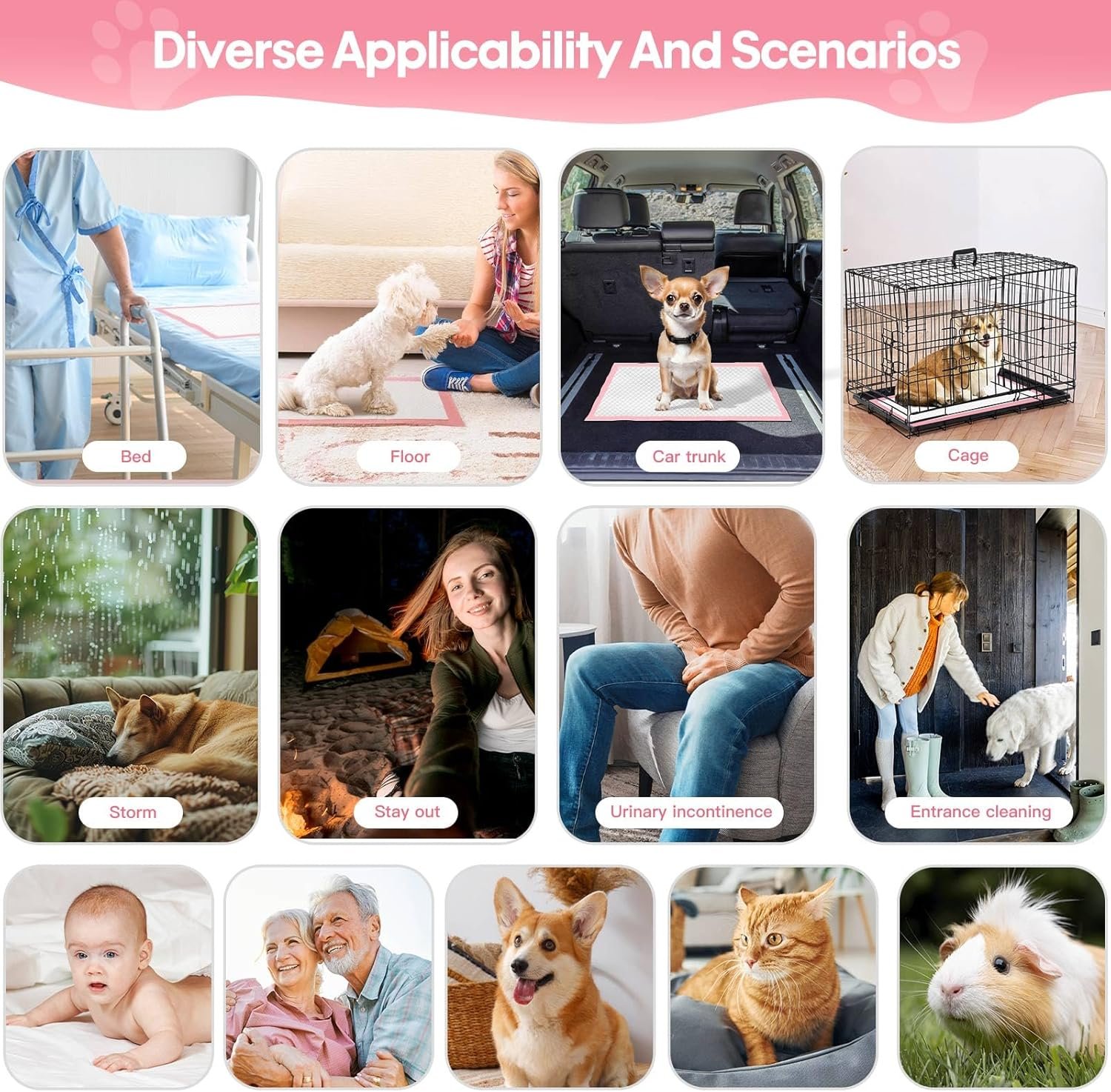 Leak-proof Protection to Keep Your Home Clean – Each of dog potty pads features the new upgraded plastic backing (thickened PE film) which is much more leak-proof, tear-resistant, and durable than most pet training pads in the market as the last-layer of the puppy pads. It can protect your floors, carpets, sofas, chairs, mattresses, beds, etc. from the urine damage by blocking leaks.