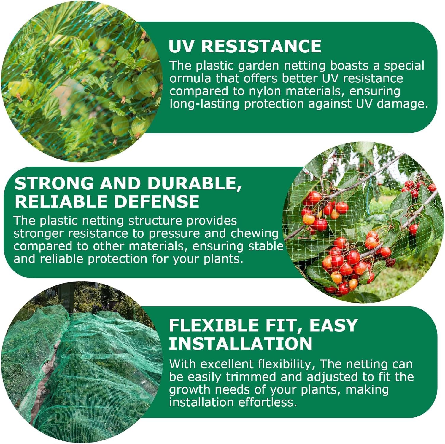 Enhanced UV resistance: Our plastic plant netting, including bird netting for gardens and blueberry bushes, offers superior UV protection compared to nylon, ensuring long-lasting durability.