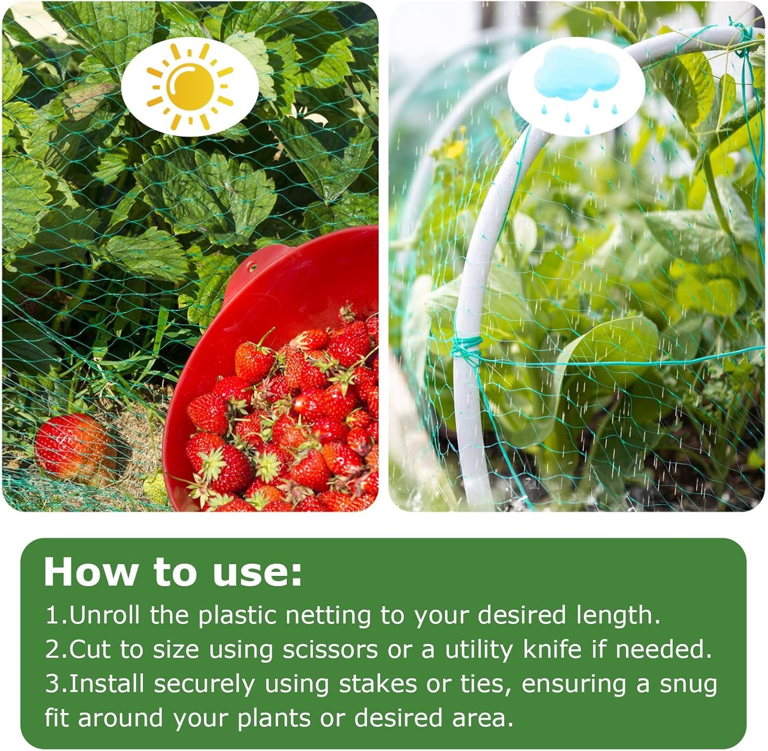 Unroll the plastic netting to your desired length. Cut to size using scissors or a utility knife if needed. Install securely using stakes or ties, ensuring a snug fit around your plants or desired area. Periodically inspect for any damage or wear, and replace if necessary. To clean, simply rinse with water as needed.