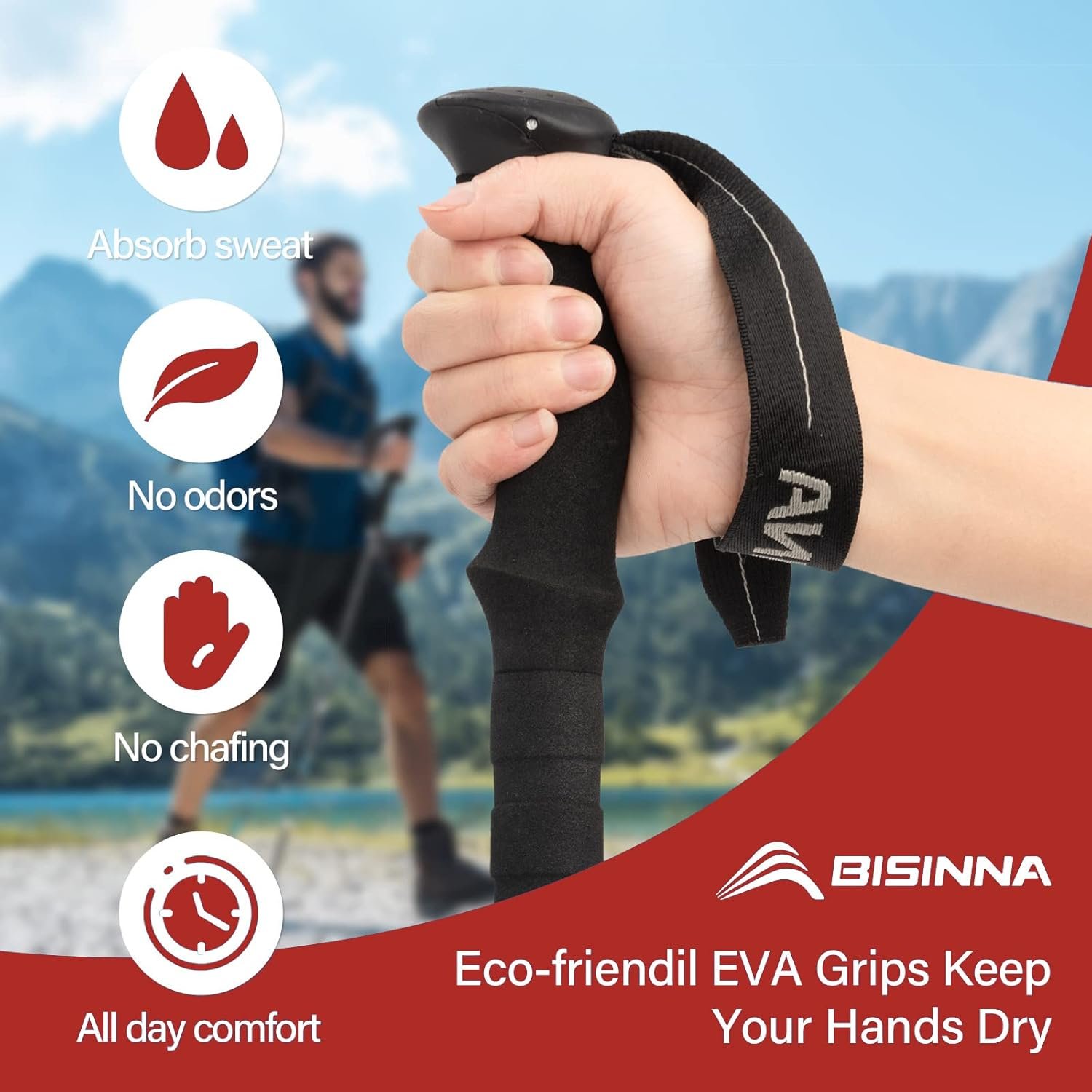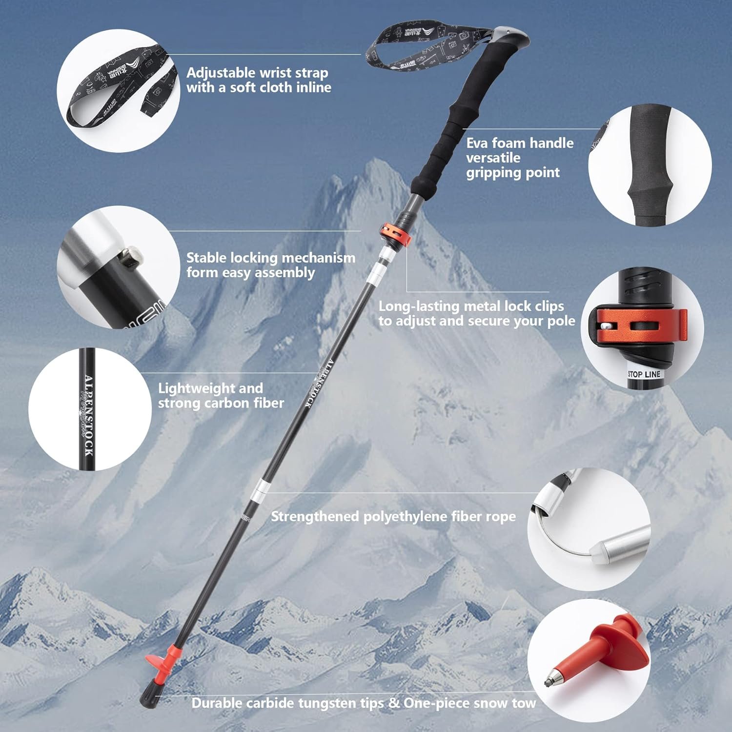 【Ergonomic Design for Protection】The Ergonomic EVA Foam Handle with wrist strap, sweat-absorbent, skid resistance groove design,more sturdy and comfortable than cork handle. Don’t worry about the risk of unglued and broken. Our wrist straps are adjustable, which allows you to hold trekking poles tightly without much effort and effectively protect your wrist.
