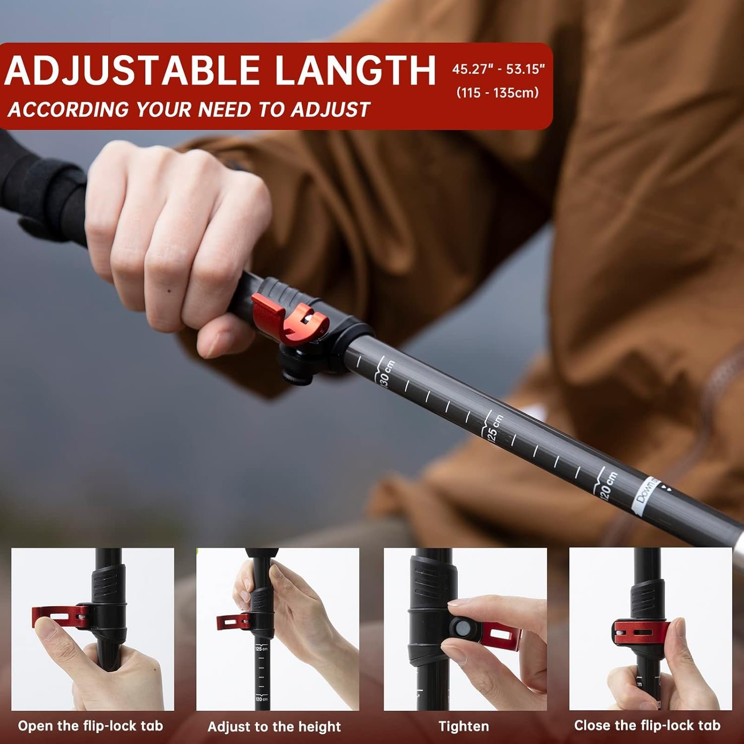 【Adjustable】Our trekking poles provide a suitable height selection, Each trekking pole can be extended to length from 45.27″ to 53.14″ inch (115-135cm), Adjust the height to the perfect height for your needs so that you can hike for longer periods without getting tired! These lengths mean that you use them as walking sticks for seniors, women, men, or as kids walking sticks!
