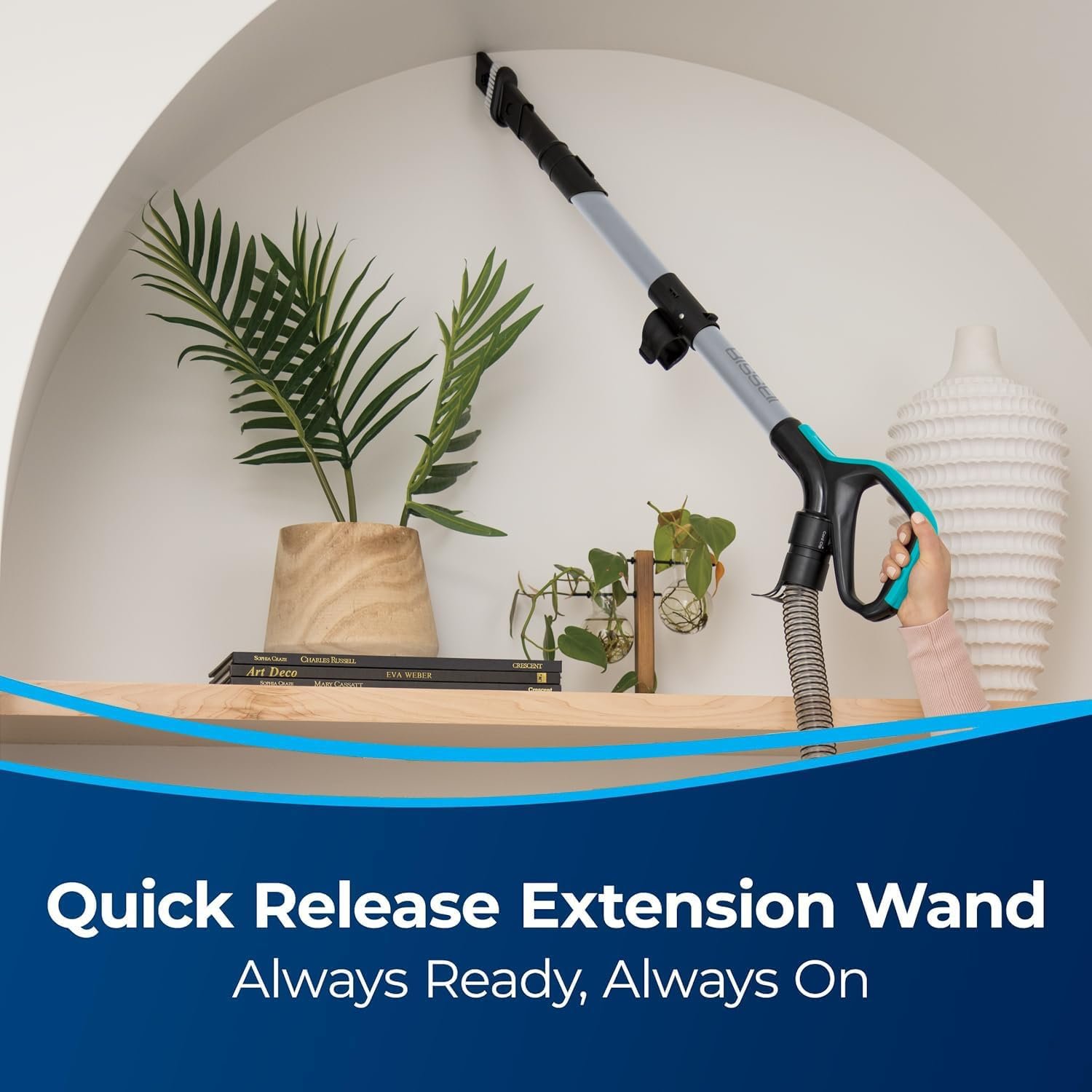 QUICK RELEASE EXTENSION WAND. Always on so it’s always ready to clean, giving you convenient above floor cleaning.