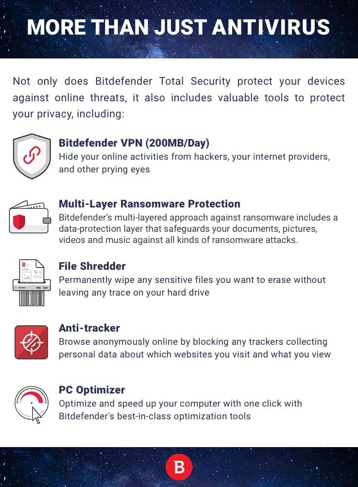TOP-TIER PERFORMANCE: Bitdefender technology provides near-zero impact on your computer’s hardware, including: Autopilot security advisor, auto-adaptive performance technology, game/movie/work modes, OneClick Optimizer, battery mode, and more
