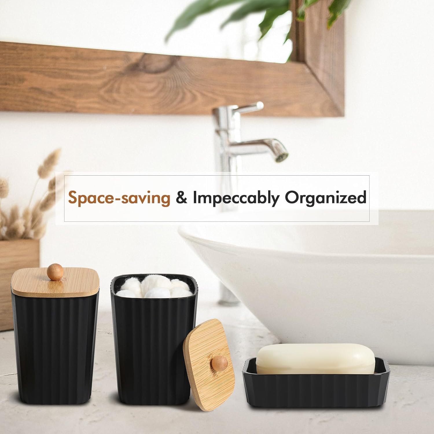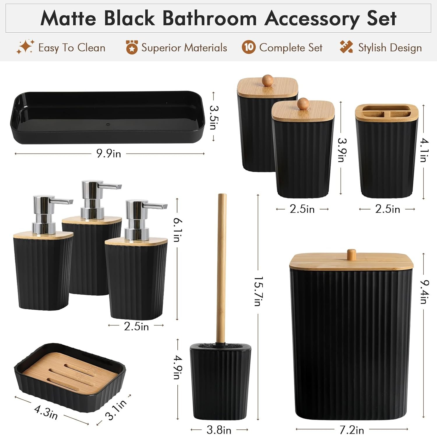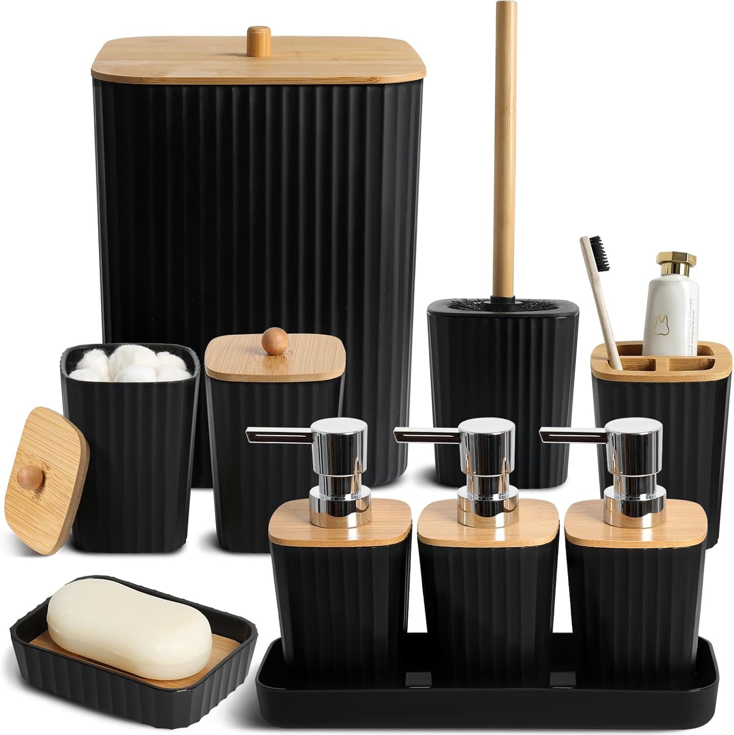 【STURDY MATERIALS AND UNIFIED DESIGN】Crafted from sturdy plastic, these black bathroom accessories are built to last and easy to clean. The robust construction prevents breakage, ensuring the bathroom remains tidy. Featuring a sleek matte black finish complemented by bamboo accents and distinctive striped design, this bathroom soap dispenser set creates a touch of elegance and seamlessly blends into various decor styles.